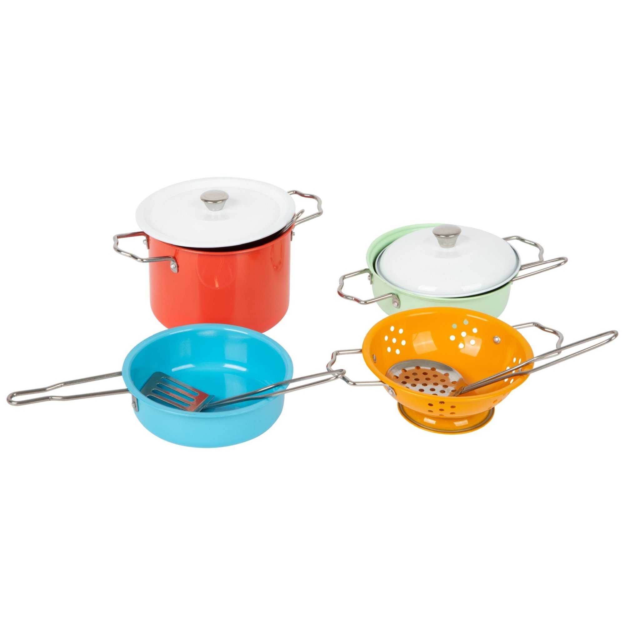 Schwingt den Kochlöffel! Dieses lebensmittelechte Kochgeschirr-Set bestehend aus einer Pfanne, zwei Kochtöpfen mit abnehmbarem Deckel, einem Sieb, einem Pfannenwender, einer Kelle, einem Schlitzlöffel und einem Abseihlöffel aus Metall überzeugt durch seine angesagte Farbgebung und inspiriert kleine Sterneköche zu leckeren Gerichten. Damit macht das Kochen in der Kinderküche noch mehr Spaß. Beim Spielen mit diesem farbenfrohen Küchenzubehör-Set werden das Rollenspiel und die motorischen Fähigkeiten gefördert. Besonders praktisch: Die Topfdeckel sind mit der Bratpfanne kompatibel.