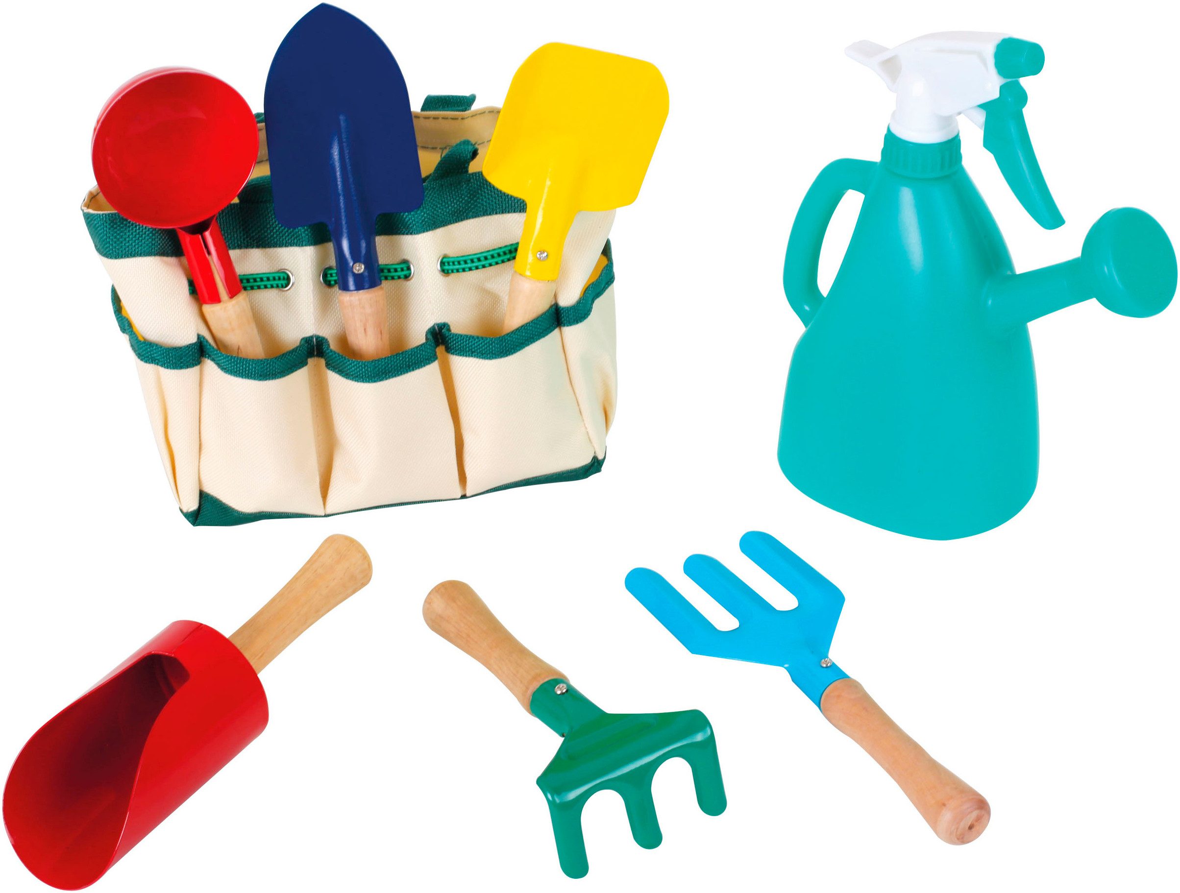 Lieferumfang | 1 Gartentasche 1 Gießkanne 6 Gartengeräte |