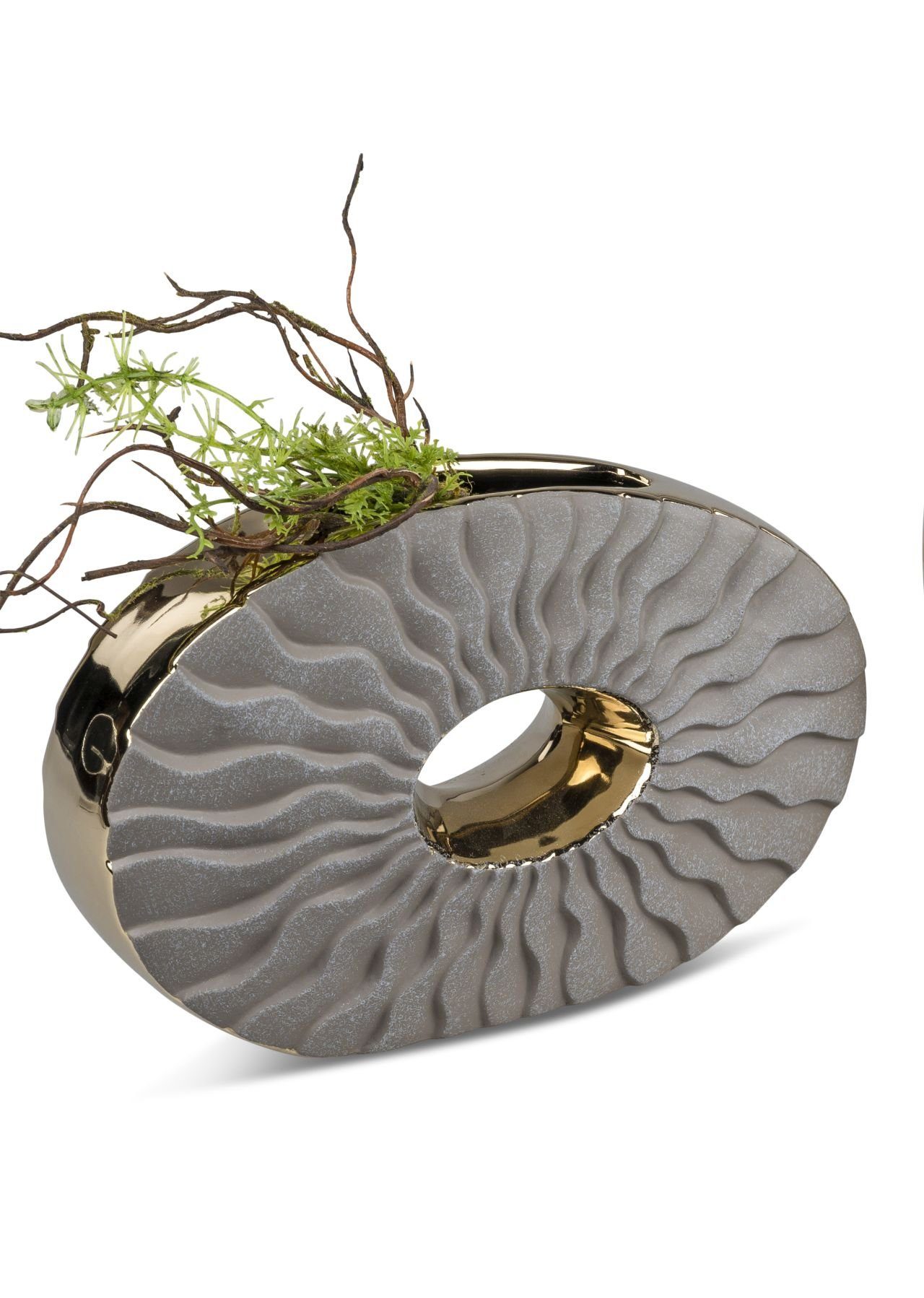 Diese Vasen werten das Ambiente Ihres geschmackvoll eingerichteten Zuhauses auf und sind unabhängig von Ihren Dekorationen, mit der Sie diesen Vasen Ihren persönlichen Stil geben, ein edler Hingucker. Als Dekorationsmöglichkeiten eignen sich stilvolle künstliche Blütenzweige- schauen Sie sich gerne in unserem Shop um. Ihrer Phantasie sind beim Arrangieren dieser edlen Vase keinerlei Grenzen gesetzt. Aus Keramik, Sand/Goldfarben, ist jede Vase ein Schmuckstück für Ihr gemütliches Zuhause. Die Vasen sind in 2 unterschiedlichen Formen erhältlich, wirken einzeln oder im Verbund. Sie haben die freie Wahl. Eine prima Geschenkidee, die bei Menschen mit Stil und Geschmack, immer gut ankommt. Nicht nur für den Alltag geeignet, sondern auch als Dekoration für feierliche Anlässe wie Hochzeit, Geburtstag, Weihnachten oder Jubiläum. Lieferumfang: 1 Vase Ihrer Wahl Dekorationsgegenstände gehören nicht zum Angebot