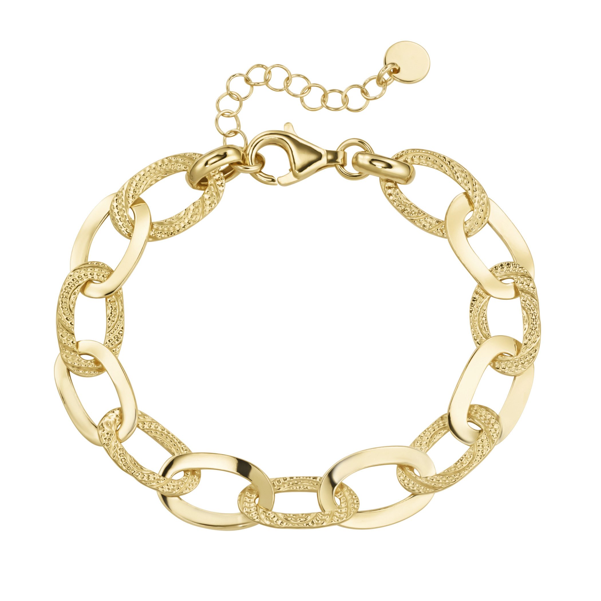 Entdecken Sie die zeitlose Eleganz und raffinierte Handwerkskunst dieses exquisiten Armbands! Das wunderschöne Schmuckstück ist ein wahres Meisterwerk der Schönheit und des Stils das jeden Anlass veredelt und Ihren Look mit seiner unvergleichlichen Anziehungskraft bereichert. Die großen ovalen Glieder, präsentieren sich in einem faszinierenden Wechselspiel von Hochglanz und strukturierter Oberfläche. Diese sorgfältig gestalteten Glieder verleihen dem Armband eine einzigartige Dimension und einen Hauch von Luxus, der sofort ins Auge fällt und bewundert wird. Die praktische Regulationskette mit Karabinerverschluss ermöglicht es Ihnen, die Длина des Armbands nach Ihren Wünschen anzupassen, so dass es perfekt zu jedem Outfit und Anlass passt. Hergestellt aus hochwertigem Sterling Silber 925 und kunstvoll vergoldet, strahlt dieses Armband eine unvergleichliche Eleganz und einen luxuriösen Glanz aus, der Ihren persönlichen Stil perfekt ergänzt und Ihren Auftritt unvergesslich macht. Investieren Sie in zeitlose Schönheit mit diesem atemberaubenden Armschmuck – ein Must-have für Ihre anspruchsvolle Schmucksammlung und für jeden, der nach einem einzigartigen und ausgefallenen Accessoire sucht. Das Schmuckstück zeichnet sich durch die Verwendung von qualitativ hochwertigen Edelmetallen, sowie exzellenter Verarbeitung aus und unterliegt strengsten Qualitätskontrollen. Hierdurch erreichen wir einen hohen Tragekomfort, lange Haltbarkeit und beste Kundenzufriedenheit. Jedes Schmuckstück ist eine Einzelanfertigung und kann daher eine Toleranz in der Размер aufweisen. MADE IN EUROPE!