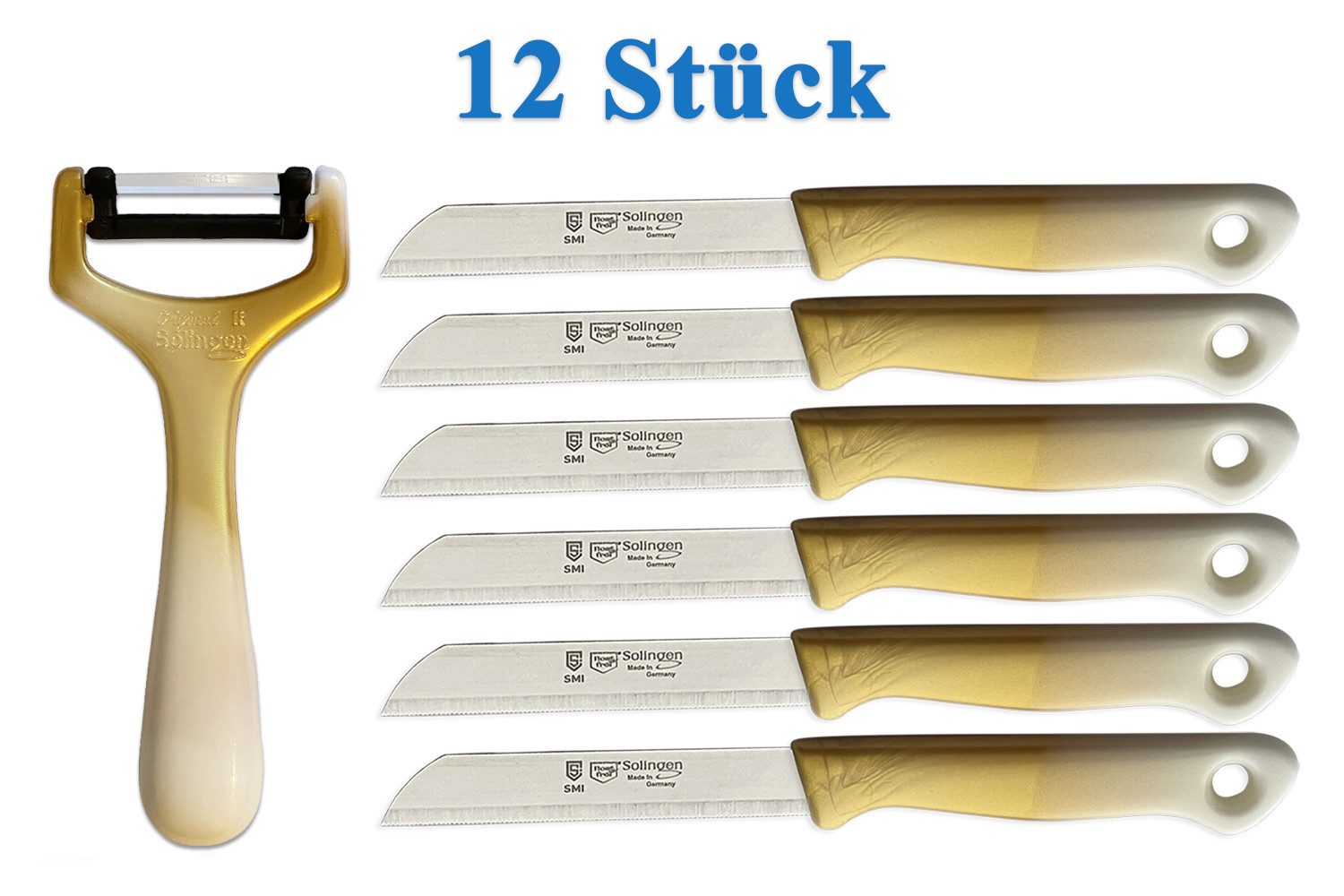 Dieses 12-teilige SMI Schälmesserset mit Wellenschliff bietet präzise Schnitte für Obst und Gemüse. Die rostfreien Edelstahlklingen aus Solingen stehen für höchste Qualität und Langlebigkeit. Dank ergonomischem Griffdesign liegen die Messer leicht und sicher in der Hand. Ein praktischer Schäler ergänzt das Set – ideal für den täglichen Einsatz in jeder Küche. Modernes, funktionales Design macht dieses Set zu einem unverzichtbaren Helfer im Alltag.