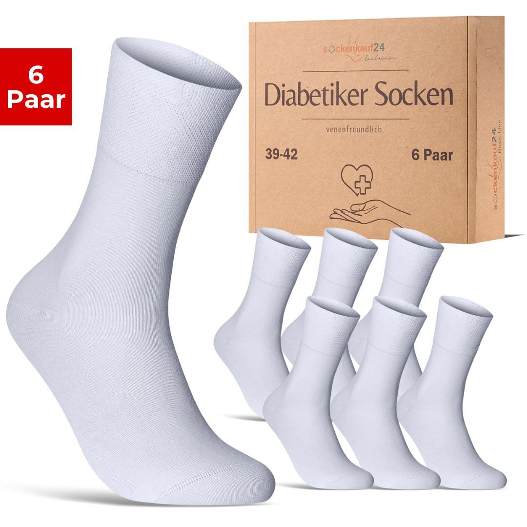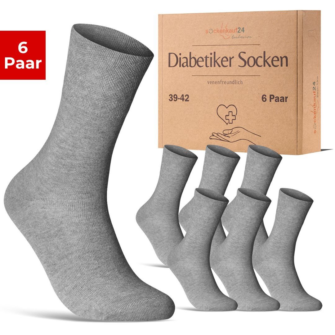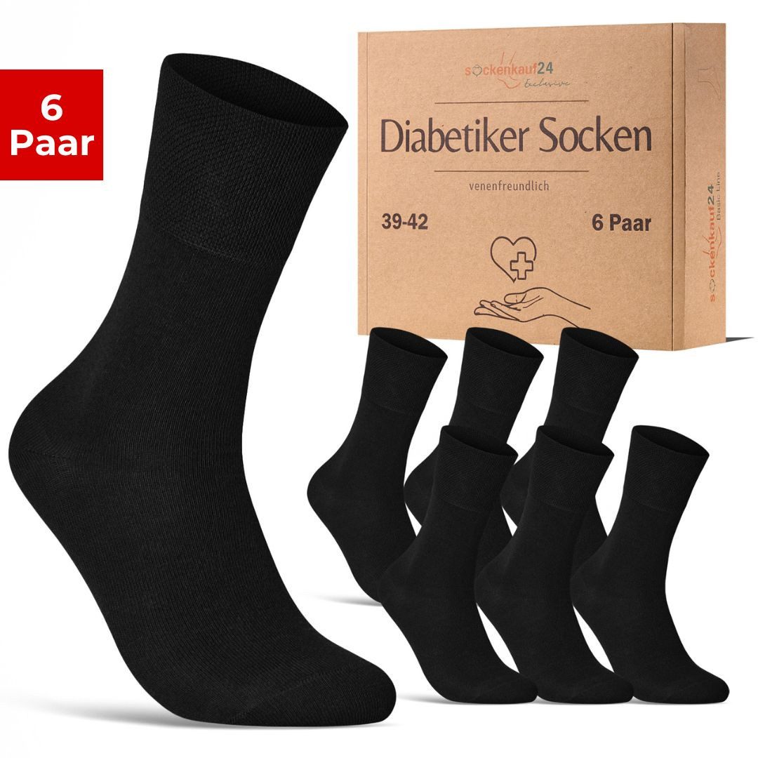 PREMIUM MATERIALIEN: Unsere Exclusive Diabetikersocken für Damen und Herren überzeugen durch 97% hochwertige, gekämmte Baumwolle und 3% Elastan. Das Resultat: ein besonders weiches und hautfreundliches Tragegefühl. Die hochwertige Verarbeitung sorgt dafür, dass die Socken langlebig, formstabil und elastisch bleiben. Diese Socken bieten nicht nur Qualität, sondern auch klimaregulierenden Komfort für deine Füße – keine Schweißfüße, nur das Beste für deine Gesundheit. HÖCHSTER KOMFORT: Vergiss lästige Socken, die drücken oder rutschen! Unsere Socken passen sich perfekt an, ohne einzuschneiden oder zu verrutschen. Die nahtfreie, handgekettelte Spitze verhindert unangenehme Druckstellen und sorgt für ein venenfreundliches Trageerlebnis. Genieße höchsten Komfort den ganzen Tag, ohne Kompromisse. GESUNDHEIT & WOHLBEFINDEN: Unsere Socken sind nicht nur angenehm zu tragen, sondern auch darauf ausgelegt, deine Fußgesundheit zu unterstützen. Der hohe Anteil an gekämmter Baumwolle macht sie besonders weich und sorgt für eine atmungsaktive Umgebung, die Schweißfüße verhindert. Die nicht einengende Passform schützt vor Druckstellen und ist ideal für Diabetiker, die besonderen Wert auf Komfort und Gesundheit legen. DEINE BESTE ENTSCHEIDUNG: Egal ob für Frauen oder Männer – unsere Exclusive Diabetiker Socken bieten dir höchste Qualität und einen venenfreundlichen Sitz. Diese Socken sind die perfekte Wahl für alle, die langlebige Materialien und durchdachtes Design schätzen. Gönn deinen Füßen das Beste, was sie verdienen, und entscheide dich für Socken, die deine Gesundheit fördern und dabei unglaublich bequem sind.