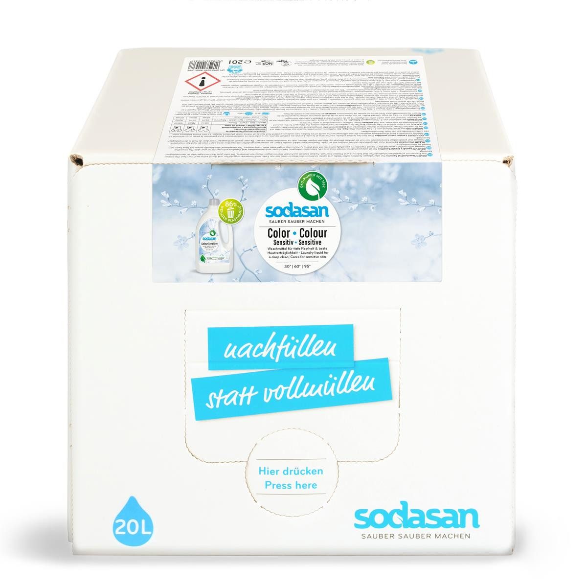 Im Lieferumfang enthalten: Sodasan Color Waschmittel Sensitiv BiB 20LInhaltsstoffe | >30 % Wasser, 5 – 15 % Pflanzenseife*, Citrate, <5 % nichtionisches Tensid (Zuckertensid), Natriumhydrogencarbonat, Ethanol*, Glycerin*, anionisches Tensid (Fettalkoholsulfat), Siedesalz. *8 % der gesamten Inhaltsstoffe sind aus kontrolliert biologischem Anbau. |