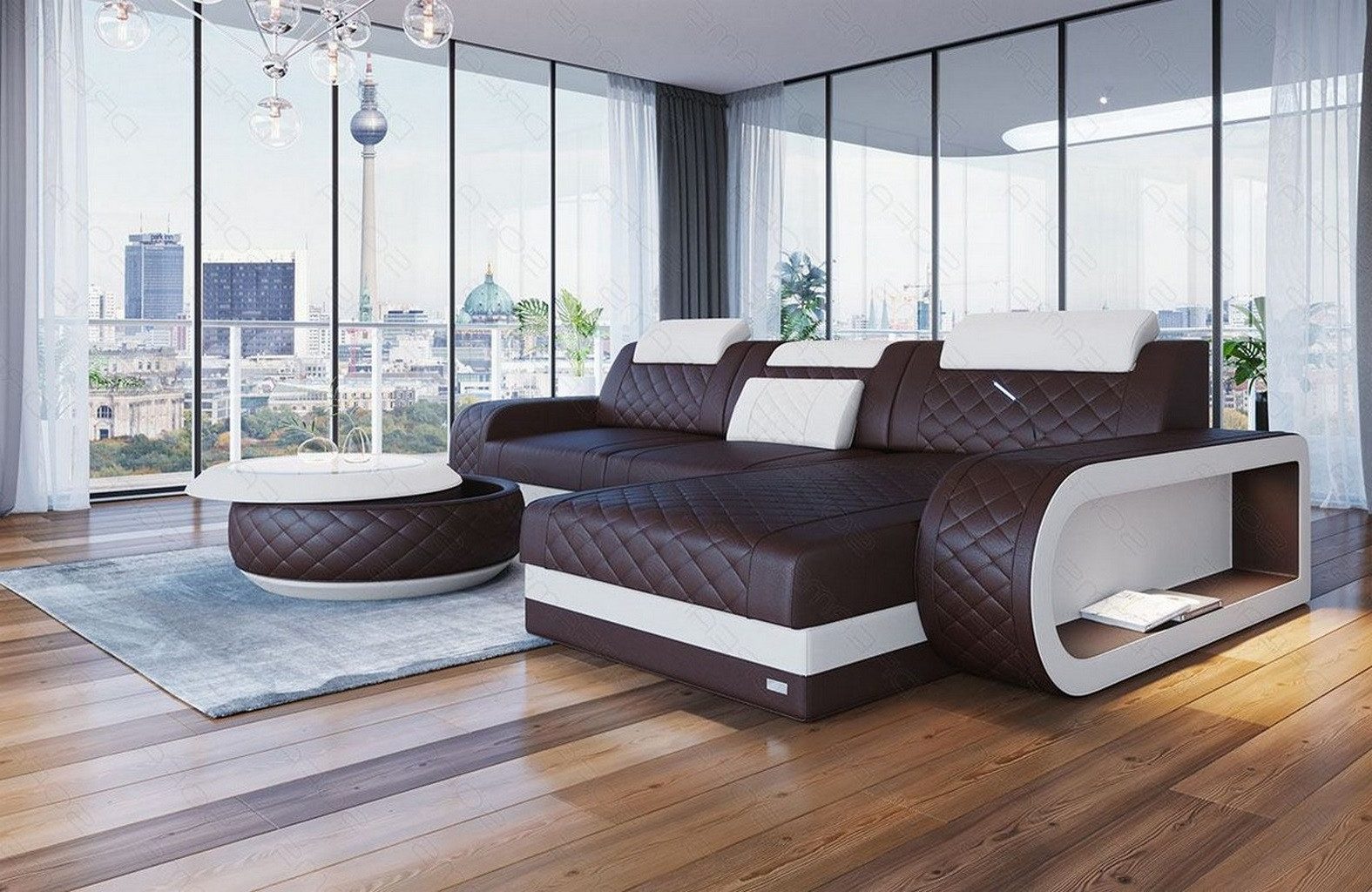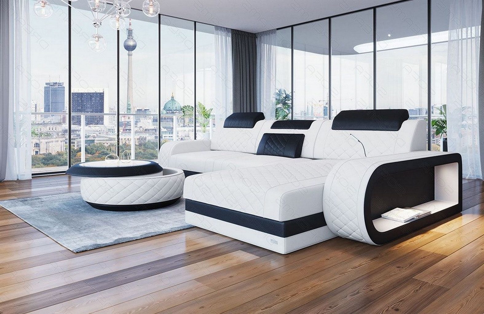 Das Leder Ecksofa Berlin L Form verbindet stilvolles Design mit modernen Features und höchstem Sitzkomfort. Die elegante Form mit Ottomane bietet viel Platz zum Entspannen und passt perfekt in jedes Wohnambiente.