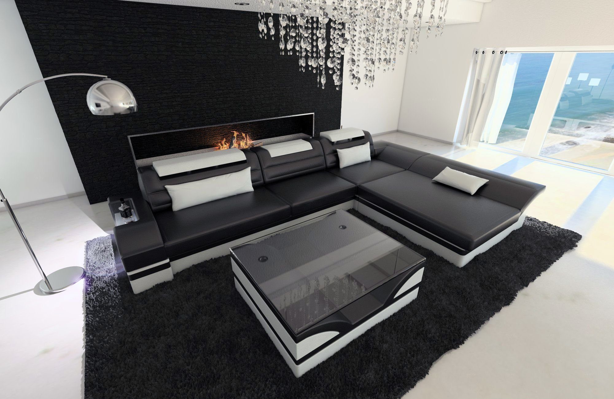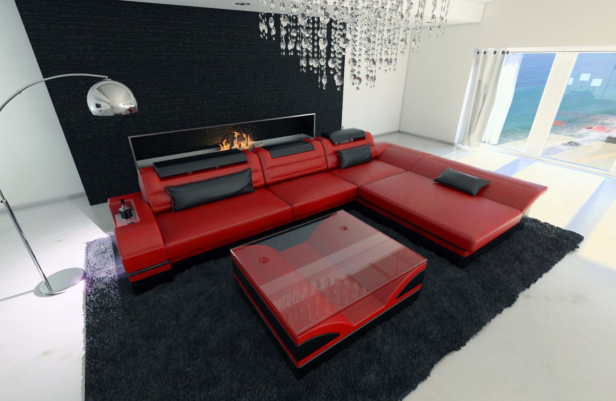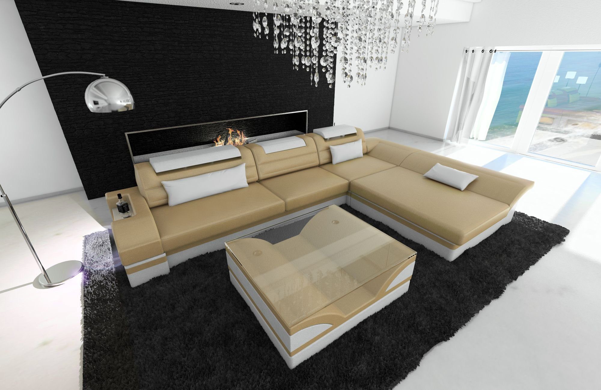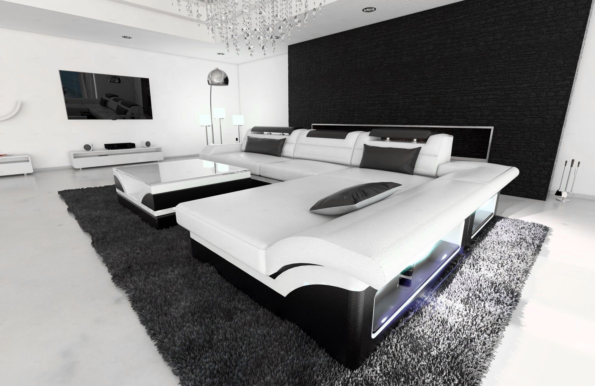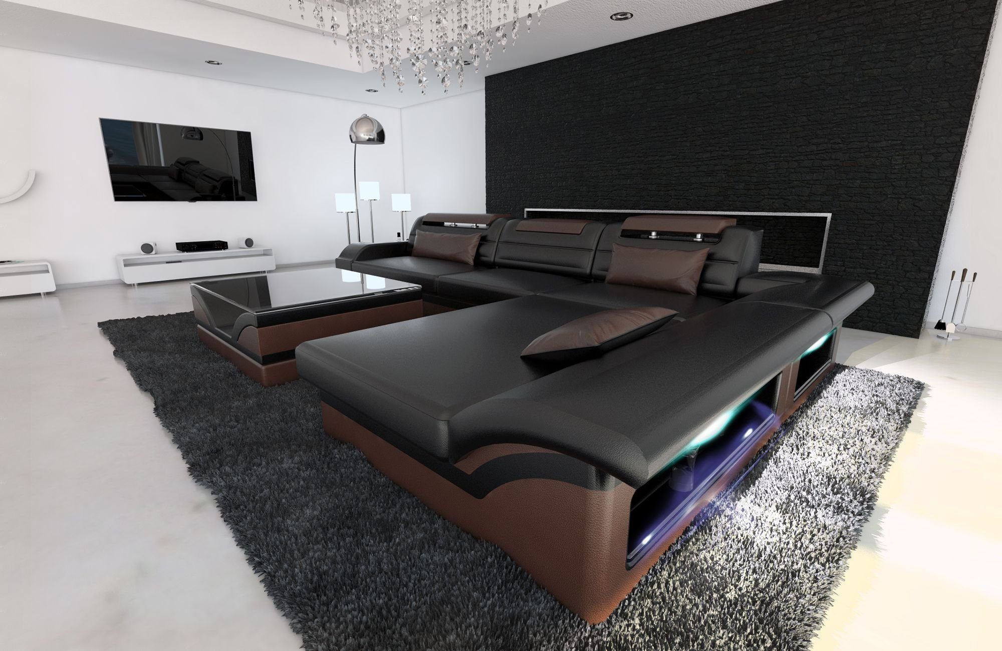 Das neue exklusive Luxus-Ledersofa Monza mit Beleuchtung kombiniert innovatives und modernes Design mit einem Höchstmaß an Sitzkomfort und Bequemlichkeit. Die vielen liebevollen Details, wie die zum Beispiel die multifunktionalen Kopfstützen und die großzügigen seitlichen Ablagen mit LED Beleuchtung runden das Gesamtbild dieses modernen Ledersofas ab. Die speziell geformten Seitenlehnen des Ecksofas sowie die weiche Polsterung und großzügigen Sitzflächen des „Monza" laden zum gemütlichen Relaxen und Entspannen ein. Die LED Beleuchtung auf beiden Seiten erzeugt immer die gewünschte Stimmung im Raum und wird ganz einfach über eine Fernbedienung gesteuert.