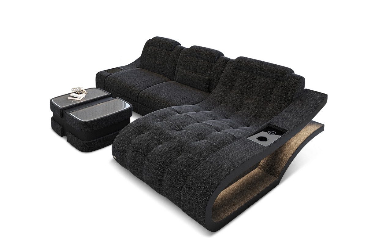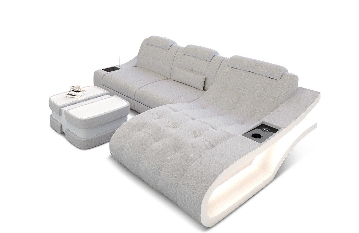 Das Ecksofa Elegante mit Ottomane und zwei Sitzplätzen bietet modernes Design in Kombination mit ausreichend gemütlichem Komfort für mehrere Personen. Durch die L-Form eignet sich dieses Ecksofa auch für Räume mit reduzierten Stellmöglichkeiten. Die Ottomane mit bequemer Liegefläche ist wahlweise nach links oder rechts ausrichtbar. Die Kopfstützen sind sehr komfortabel, aber nicht verstellbar. In den Seitenteilen mit geschwungenem Design befinden sich eine Ablagefläche und eine LED-Beleuchtung mit Farbwechsel und Fernbedienung. Das Material des Sofagestells besteht aus robustem, rissfestem Buchenholz. Das entspannte und gemütliche Sitzgefühl wird durch die Bonell-Federung und die schichtweise aufgebaute Polyether-Kaltschaumfüllung erreicht.