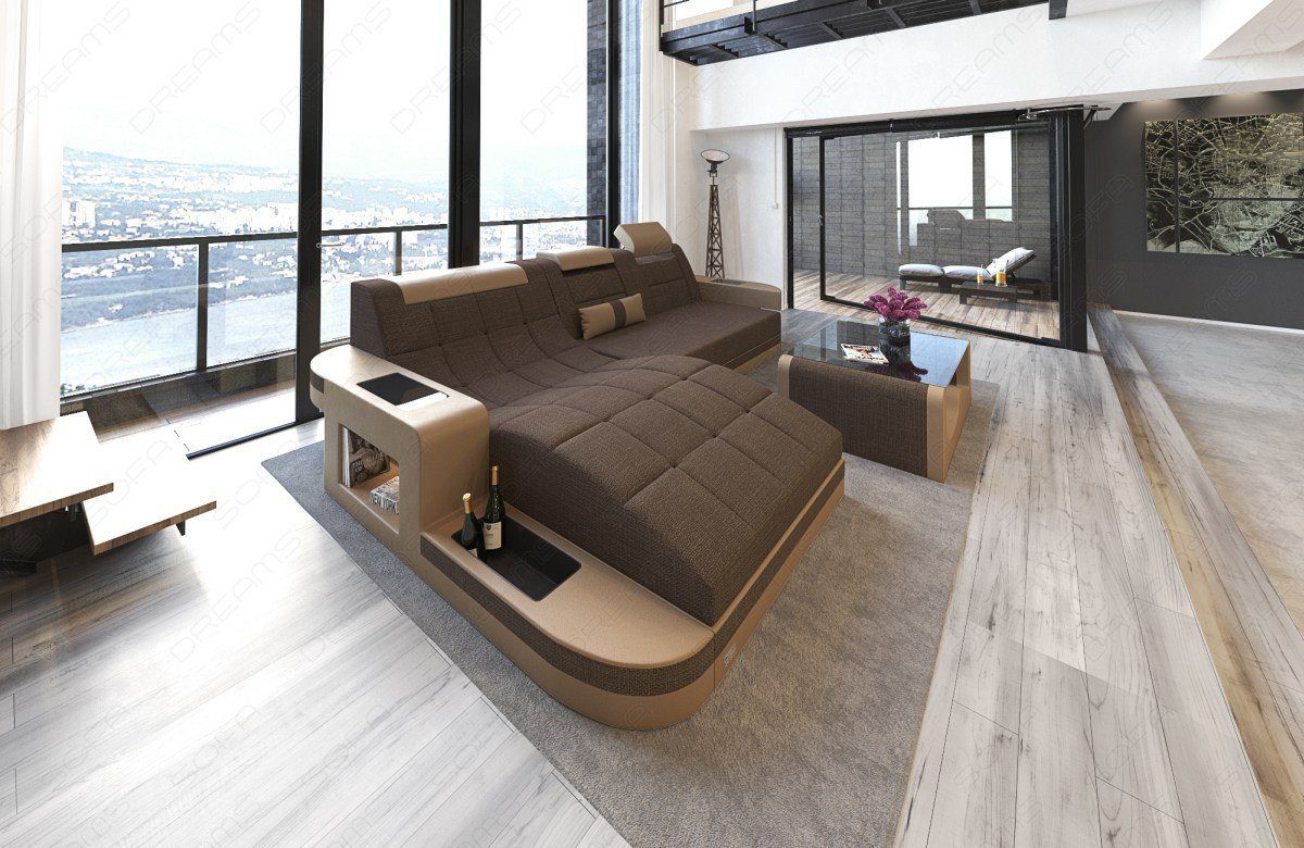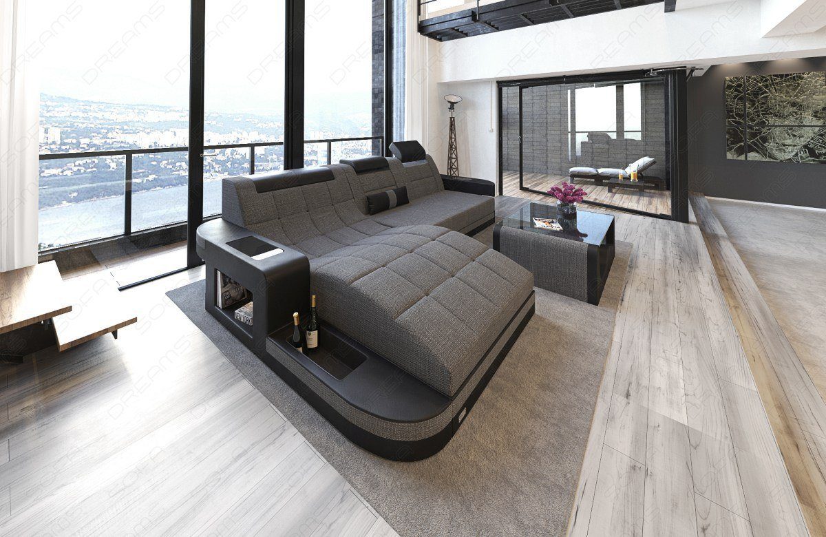 Die Wohnlandschaft Wave L Form ist ein Sofa, das in jeder Hinsicht Akzente setzt. Dies beginnt bei seinem markanten Design. Die wie eine Welle geformte und gesteppte Liegefläche verleiht der Eckcouch ein ebenso modernes wie individuelles Aussehen. Mustergültig ergänzt wird sie durch schicke Zierstreifen, abgerundete Kanten und in der Nebenfarbe gehaltene Kopfstützen. Ablagen in Hochglanz-Optik und eine im Gestell der Couch integrierte LED Beleuchtung mit Farbwechsel sorgen für das i-Tüpfelchen. Die Wohnlandschaft Wave ist ein Prachtstück für alle, die sich mehr von einem Sofa erwarten als einen schlichten Rückzugsort. Das Gestell des Designersofas Wave ist mit Premium Kunstleder bezogen, einem ebenso ansprechenden wie robusten Material. Für Sitz- und Liegeflächen bieten wir Ihnen zwei verschiedene Вариантыn an: Unseren beliebten Strukturstoff Hugo und hoch entwickelten Mineva Stoff. Profitieren Sie von einer attraktiven Optik, hoher Verschleißfestigkeit und Pflegeleichtigkeit. Dank multifunktionaler Kopfstützen, erstklassiger Wellen-Federung und viel Platz ist ein komfortabler Feierabend garantiert. Möchten Sie die Wohnlandschaft Wave noch zusätzlich ausdehnen, liefern wir Ihnen das Sofa gerne mit Schlaffunktion und Couchtisch.