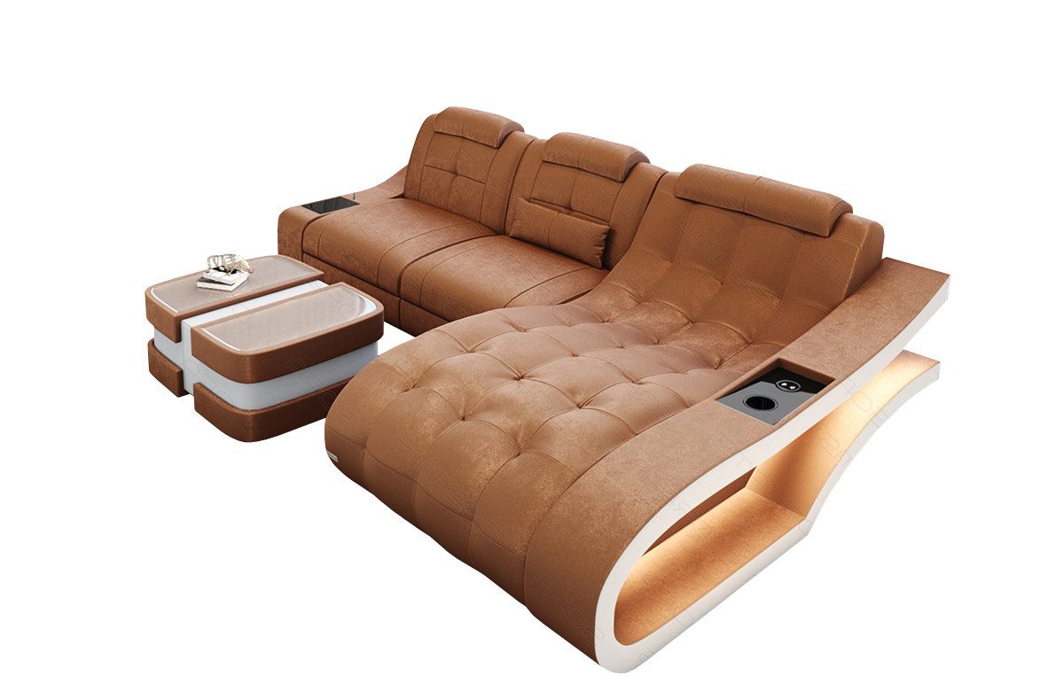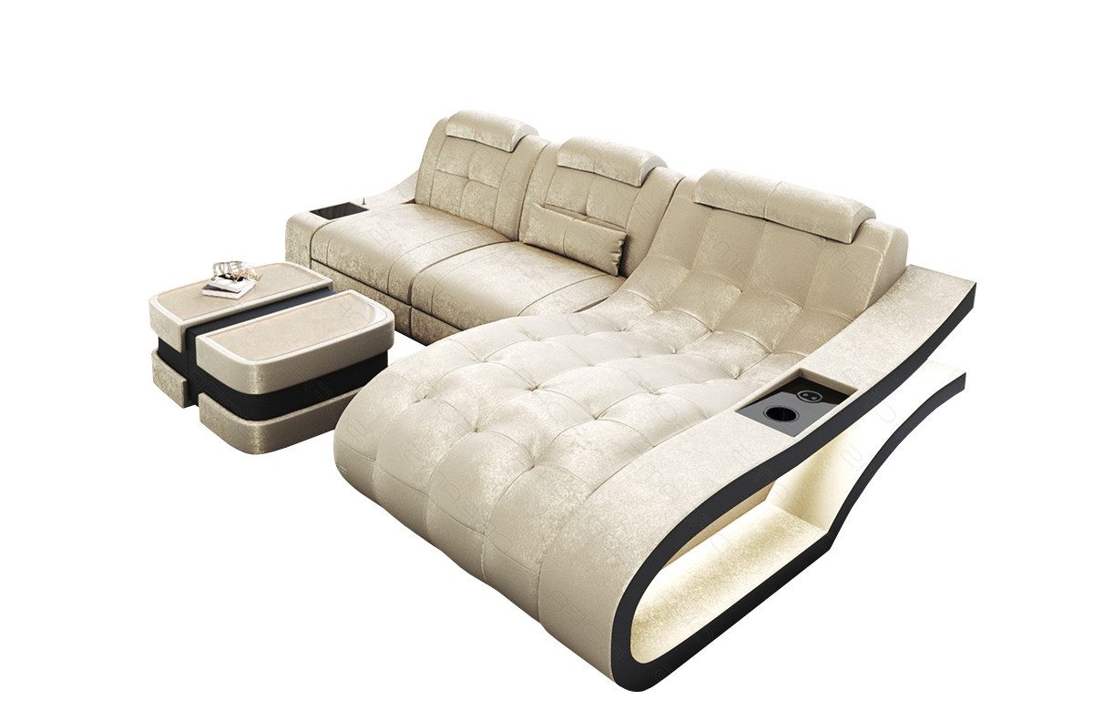 Das Ecksofa Elegante mit Ottomane und zwei Sitzplätzen bietet modernes Design in Kombination mit ausreichend gemütlichem Komfort für mehrere Personen. Durch die L-Form eignet sich dieses Ecksofa auch für Räume mit reduzierten Stellmöglichkeiten. Die Ottomane mit bequemer Liegefläche ist wahlweise nach links oder rechts ausrichtbar. Die Kopfstützen sind sehr komfortabel, aber nicht verstellbar. In den Seitenteilen mit geschwungenem Design befinden sich eine Ablagefläche und eine LED-Beleuchtung mit Farbwechsel und Fernbedienung. Das Material des Sofagestells besteht aus robustem, rissfestem Buchenholz. Das entspannte und gemütliche Sitzgefühl wird durch die Bonell-Federung und die schichtweise aufgebaute Polyether-Kaltschaumfüllung erreicht.