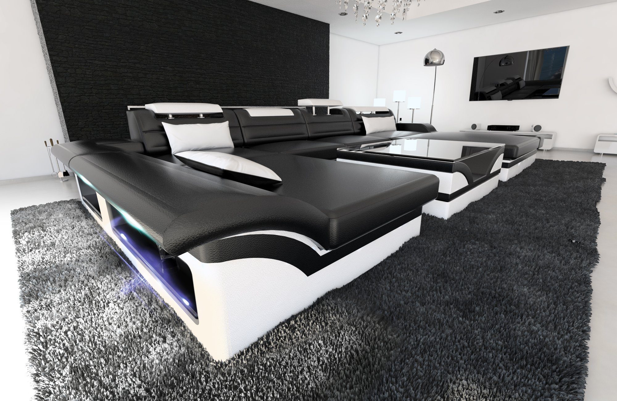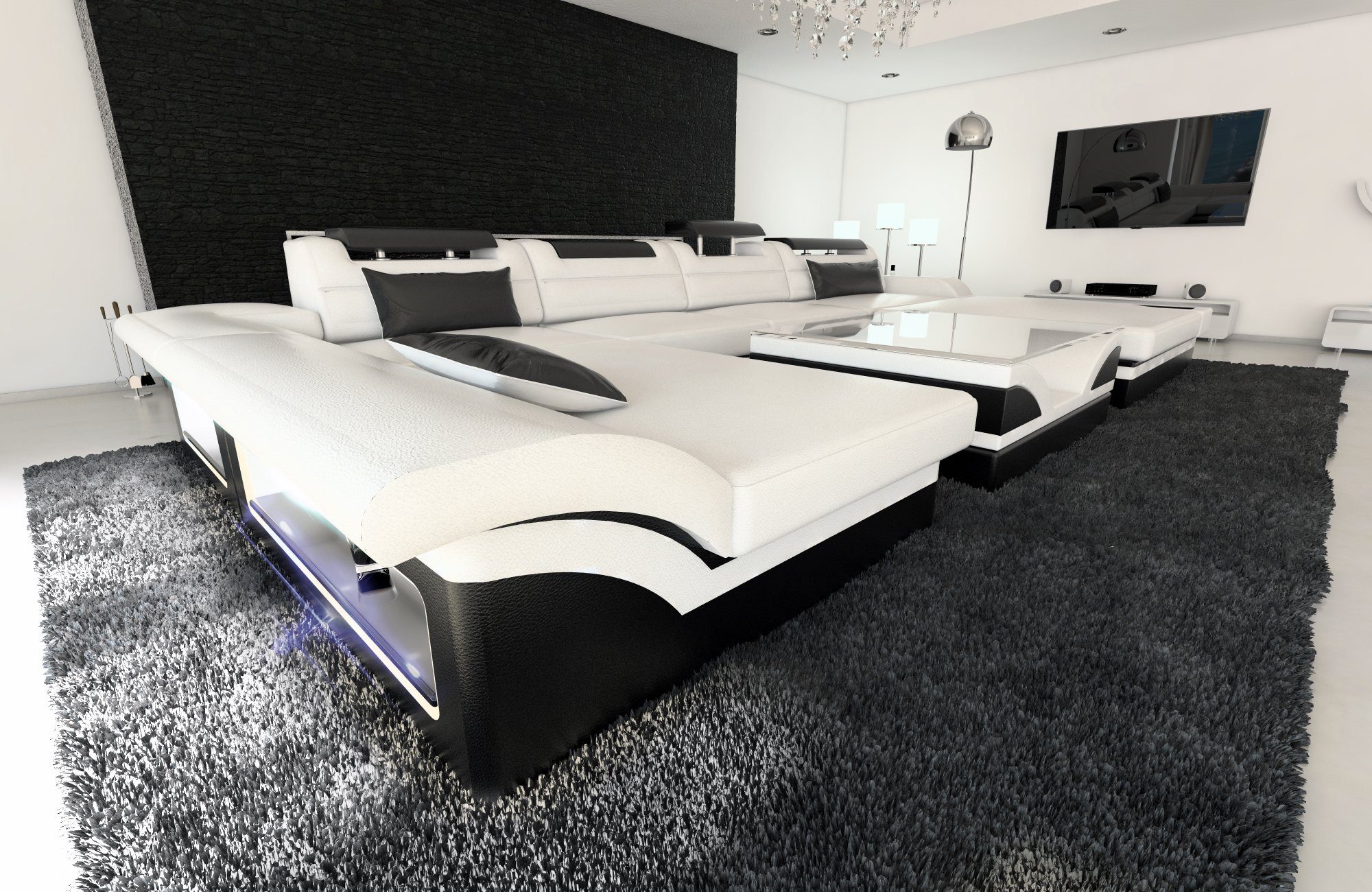 Die Wohnlandschaft MONZA vereint modernes Design, großzügige Sitzflächen und hochwertige Polsterung zu einem eleganten Mittelpunkt für Ihr Wohnzimmer. Die markante U-Form lädt zum Entspannen, Fernsehen und gemütlichen Beisammensein ein – mit ausreichend Platz für Familie, Freunde und ausgedehnte Chill-Abende. Dank individueller Bezugsvarianten (Echtleder-Mix, Voll-Echtleder oder Büffelleder), optionaler Bettfunktion und RGB-LED-Ambientebeleuchtung lässt sich MONZA perfekt auf Ihren Wohnstil und Ihre Nutzung abstimmen.
