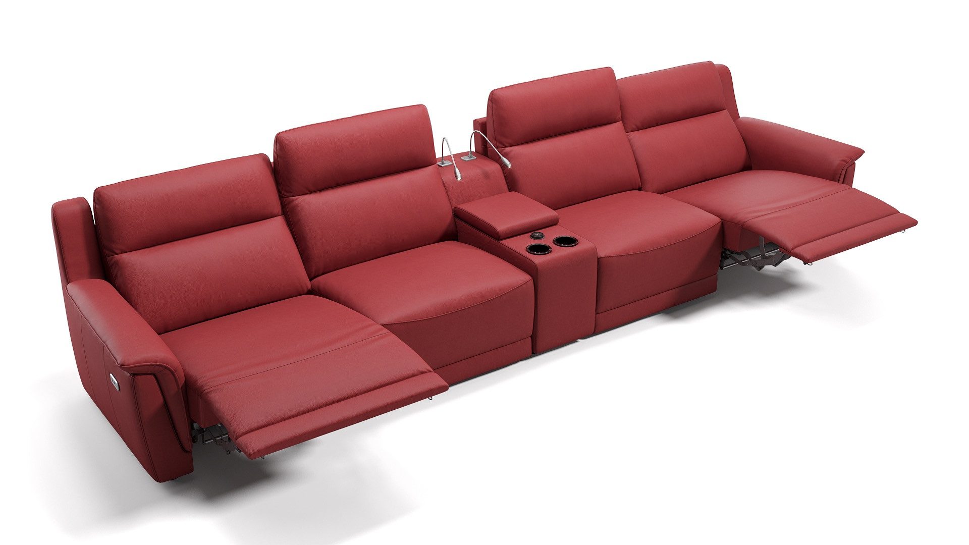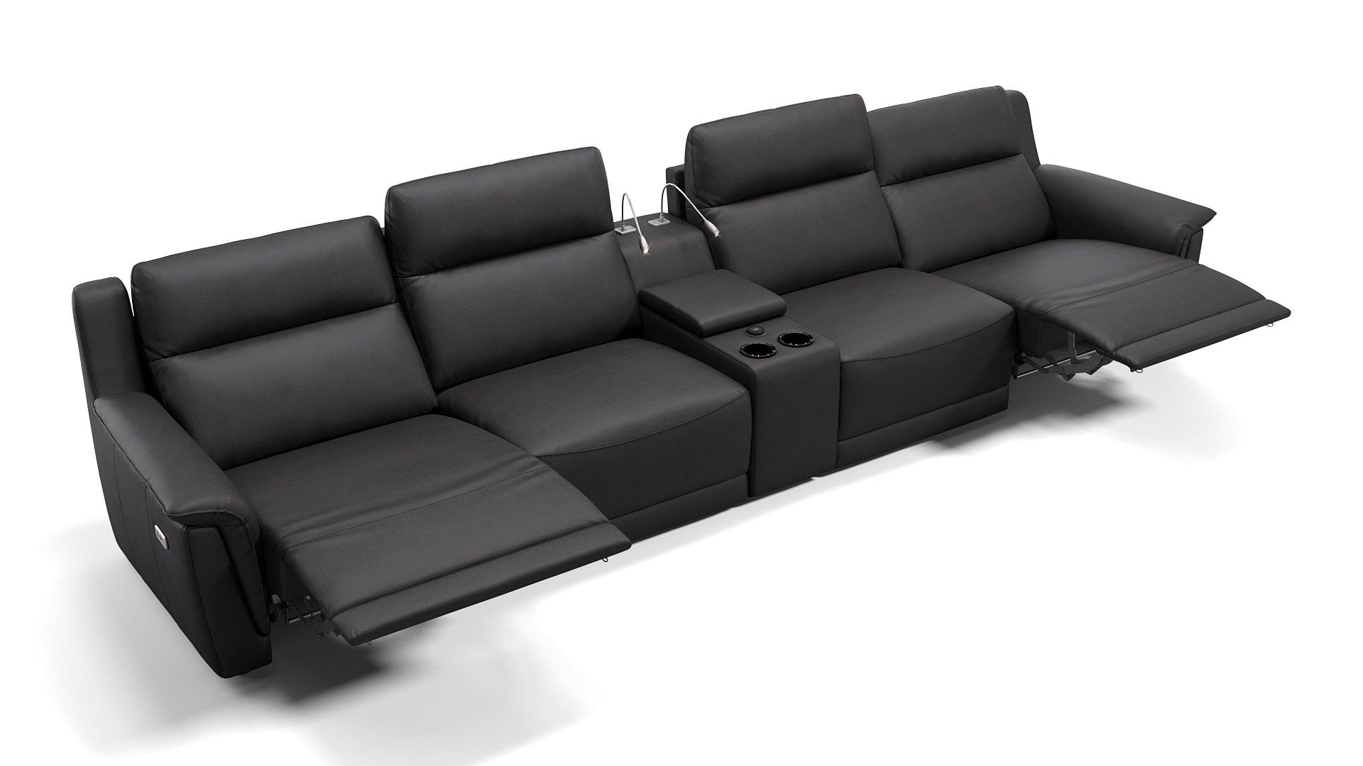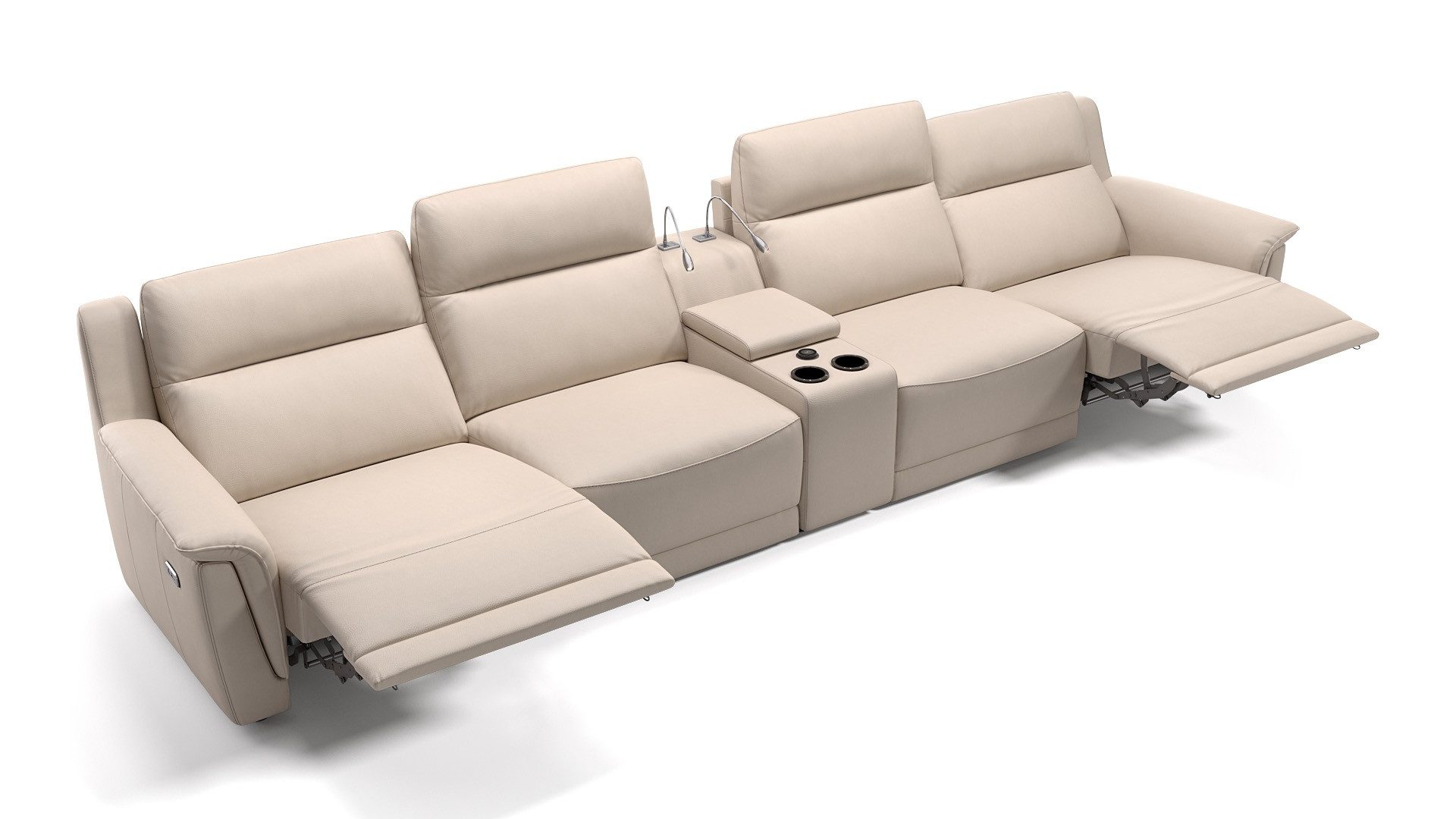 Ausstattung | Elektrische Relaxfunktion per Knopfdruck an allen Sitzen Elektrisch getrennt verstellbare Kopflehnen Getränkehalterungen mit Kühl- und Wärmefunktion Kabelloses Aufladen vom Smartphone wenn Ihr Smartphone kabelloses Aufladen unterstützt 2 verstellbare & abnehmbare LED-Leuchten Mittelkonsole mit Stauraum USB-Anschluss Sofa wandfrei stellbar |