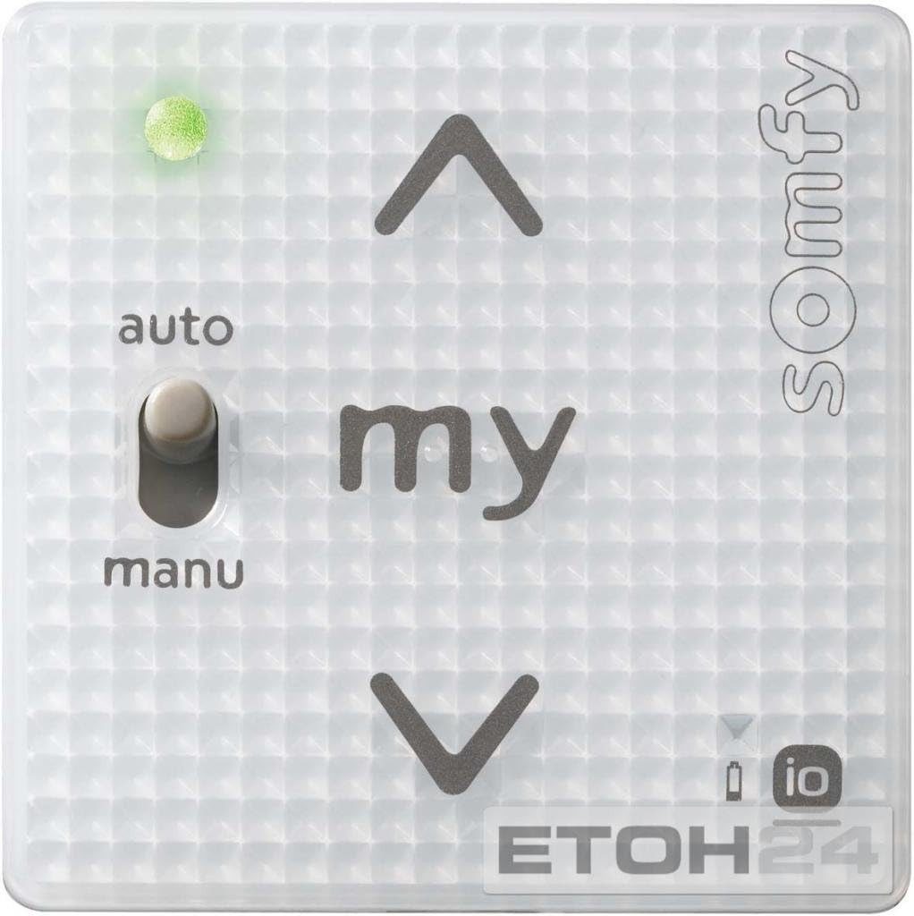 Manuelle Steuerung eines Somfy io-Funkantriebs / io-Funkempfängers oder mehrerer io-Funkantriebe / io-Funkempfänger gleichzeitig per Funk. 1-Kanal-Funkwandsender Produktvorteile Innovative Bedienung über Berührungstasten Zentralbedienung über Schiebeschalter ein- und ausschaltbar - Automatikbetrieb: Der Antrieb reagiert auf alle Befehle (Vor-Ort-Befehle, Zentralbefehle, Zeitautomatik, Wind- und Sonnenautomatik) - Manueller Betrieb: Der Antrieb reagiert nur auf die manuellen Vor-Ort-Befehle und auf Sicherheitsbefehle (Wind) Passend zu allen Schalterprogrammen über einen 50x50 mm Adapterrahmen der Schalterhersteller Vielzahl an Gestaltungsmöglichkeiten mit den Somfy Smoove Rahmen Einzel-, Gruppen- oder Zentralbedienung möglich AUF-Taste zum Öffnen des Rollladens, Einfahren der Markise bzw. Einschalten der Beleuchtung my-Taste zum Stopp oder Aufrufen der Lieblingsposition AB-Taste zum Спрятать des Rollladens, Ausfahren der Markise bzw. Ausschalten der Beleuchtung Programmiertaste auf der Rückseite des Moduls Über die Mode-Taste auf der Rückseite kann der Smoove A/M io auch für die Bedienung von Außenjalousien oder dimmbarem Licht eingestellt werden Befestigungsplatte für einfache und flexible Wandmontage, keine UP-Dose erforderlich LED zur Sendeanzeige Drahtlos und batteriebetrieben, daher geringster Installationsaufwand, mit Batteriezustandsanzeige Lieferumfang: Funkmodul inkl. Batterie, Befestigungsplatte für Somfy Smoove Rahmen und Befestigungsplatte für andere Schalterprogramme