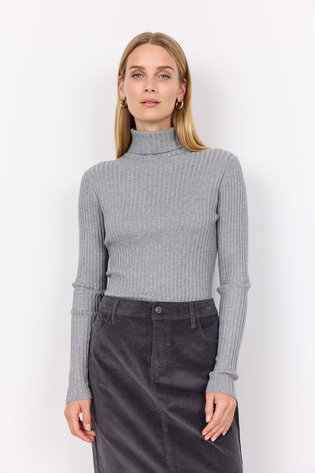 Mit dem Rollkragenpullover von soyaconcept stellst du im Handumdrehen ein neues Outfit zusammen. Der Rollkragen wird am Hals umgeschlagen und sieht schlauchartig aus. Er wärmt deinen Hals und umrahmt gleichzeitig dein Gesicht. Dieser Pullover hat einen Rundhalsausschnitt und ist hüftlang sowie figurbetont geschnitten, sodass er deine Silhouette betont.