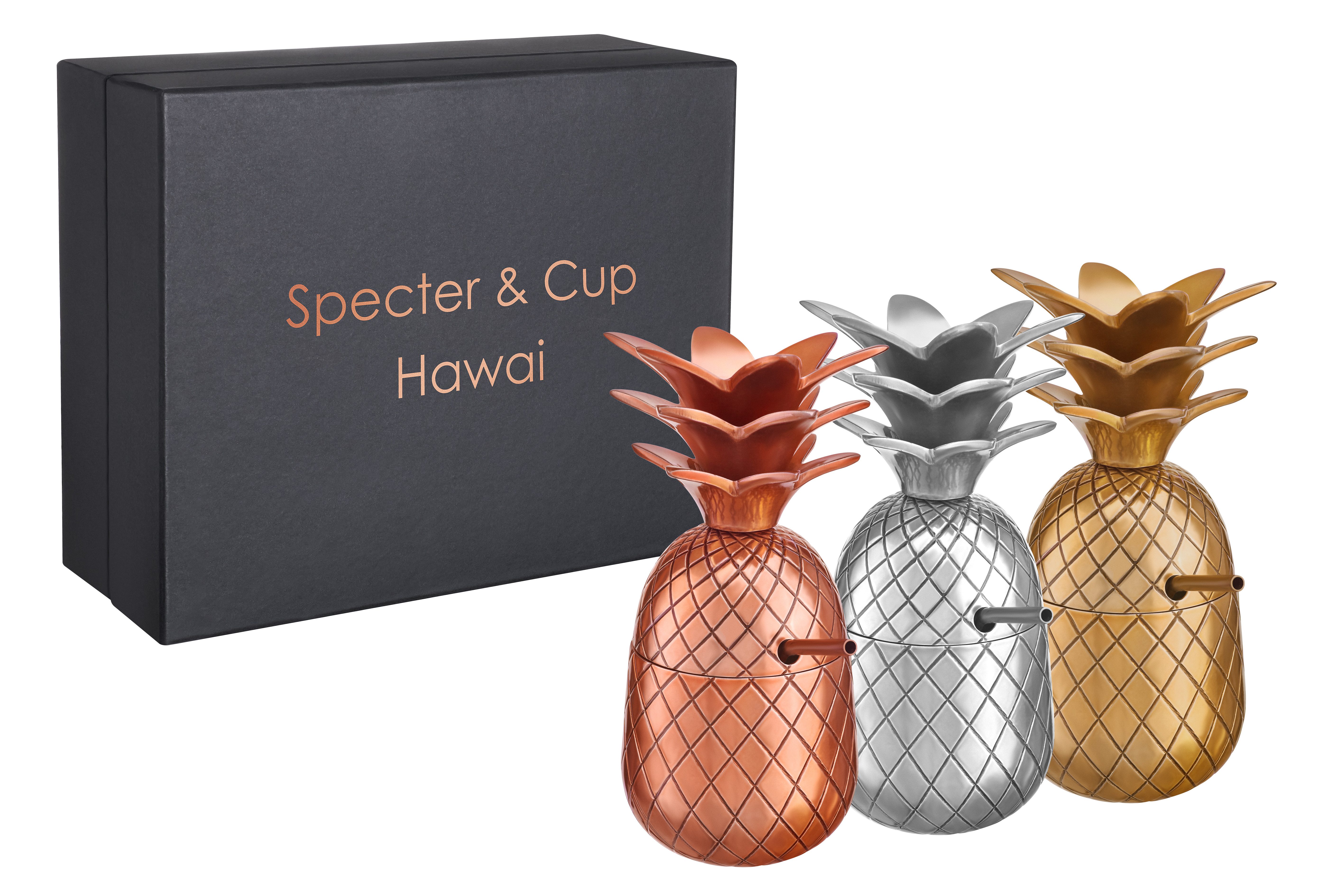 Hawai - sorgt für tolle Stimmung bei jedem Anlass. Als Dekoration oder Becher, verzückt das Set mit seinem eleganten Aussehen den Raum. Die Becher eignen sich durch die kleine Öffnung am Hals der Ananas super als Trinkbecher und sind ein wahrer Blickfang. Das Set, welches aus 3 verschiedenen Modellen unserer Mood - Serie besteht, enthält für jeden Becher zusätzlich einen Strohalm. Material: Aluminium, Inhalt: ca. 300ml; Lieferumfang: 1x Mood Gold + Strohhalm, 1x Mood Silber + Strohhalm, 1x Mood Bronze + Strohhalm, 1x Premiumverpackung.