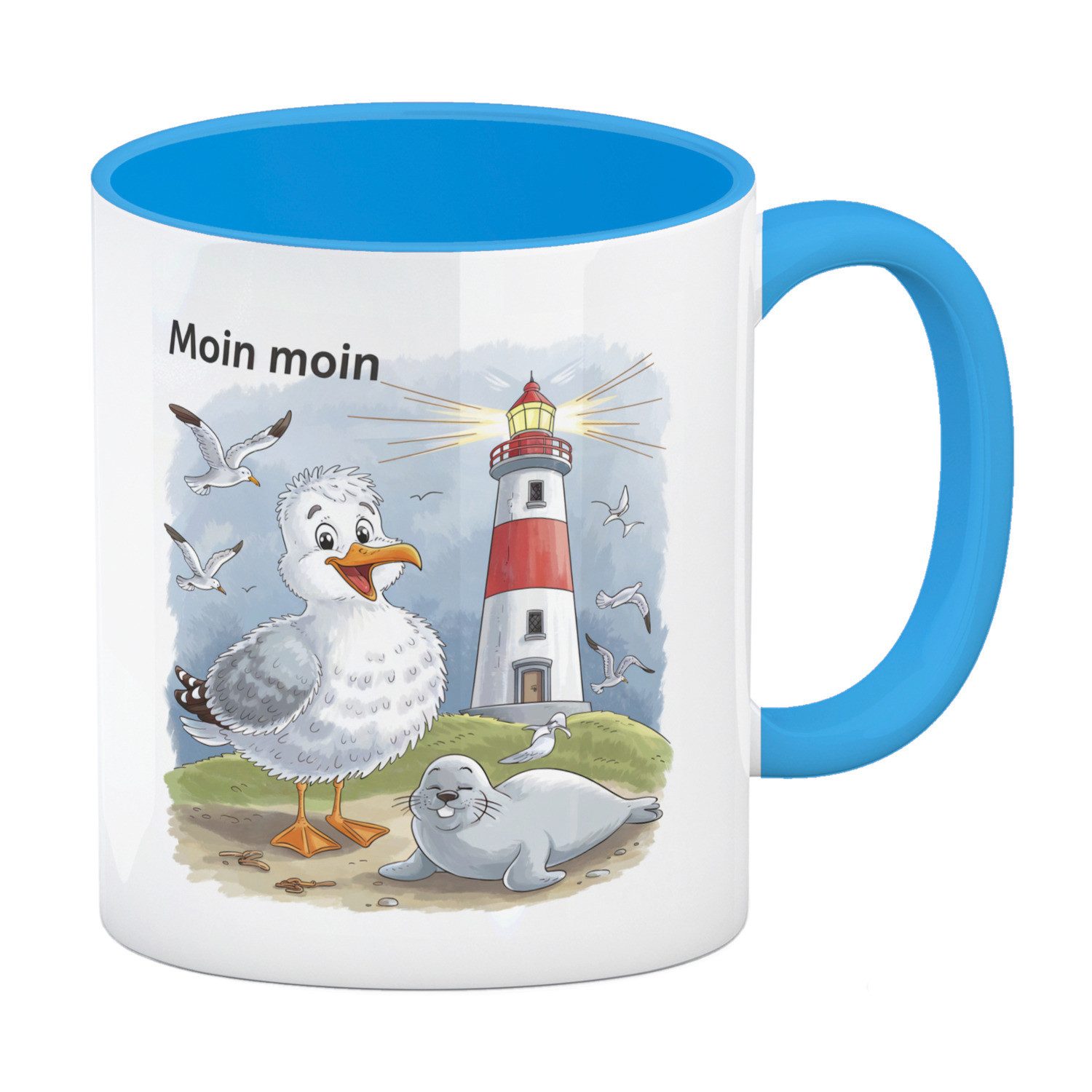 Lieferumfang: 1x Fröhliche Möwe und Leuchtturm Kaffeebecher in hellblau - MOIN MOIN