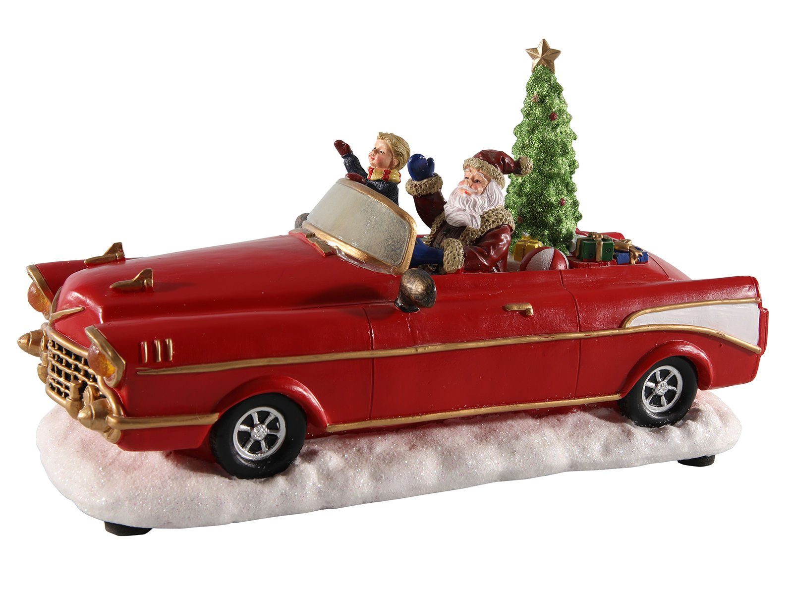 LED Weihnachts Szene "Weihnachtsmann im Oldtimer" rot - 25 cm / Batterie - Tisch Deko mit Sound Bewegung und Beleuchtung