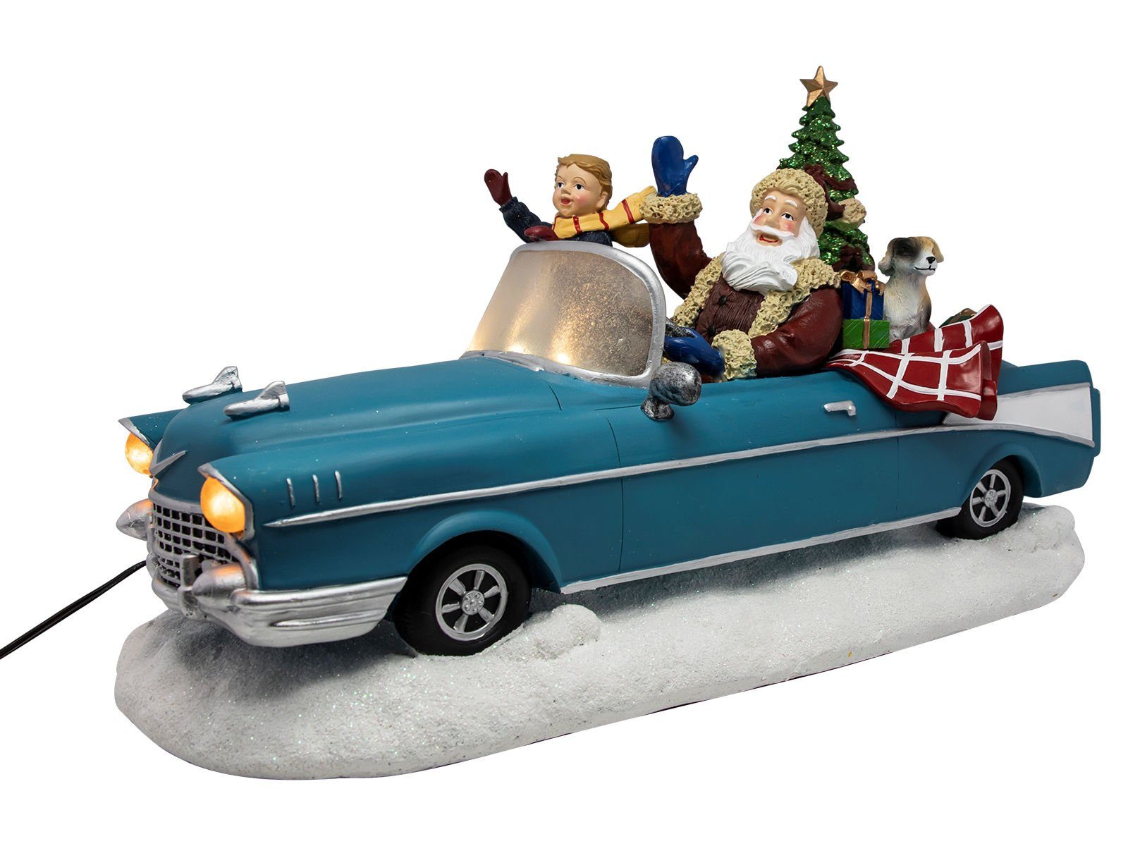 Beleuchtete Weihnachtsdorf Szene "Weihnachtsmann im Oldtimer" ca. 25 cm mit Bewegung Musik und bunten LED Lichtern - Batterie betrieben