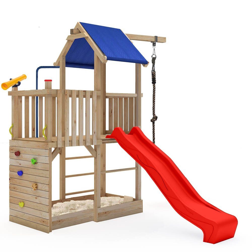 Ein kompletter Spielgerätebausatz mit vorgefertigten Massivholzbauteilen, Planendach Montagematerial, Spielgerätezubehör und ausführliche Aufbauanleitung. Der Spielturm Alex ist ein echter Klassiker und seit Jahren unser Bestseller. Zusammen mit dem Anbauturm vervielfachen sich jetzt die Spielmöglichkeiten. Hersteller spielgeräte4you und FSC zertifiziertes Holz aus Europa. Eine Wellenrutsche in passender Длина und Farbe kann wahlweise gleich mitbestellt werden.