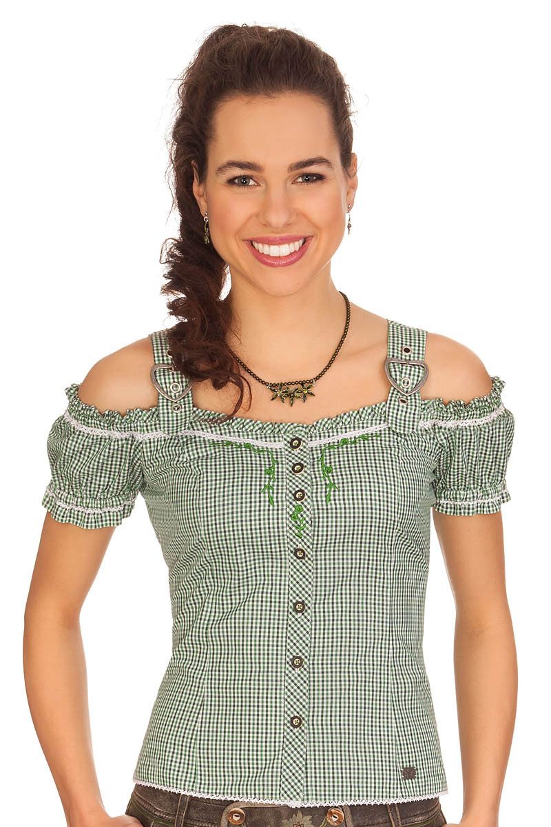 Die junge, sexy Trachtenbluse Galant in ihrem super taillierter Schnitt im Carmenstyle mit den raffinierten, verstellbaren Trägern mit Herzschnallen und den weiten Ausschnitt mit zuckersüßen Rüschen und der Häkelborte ist ein charmantes Herzstück zum verlieben. Verführerisch rutschen die Ärmelchen mit Rüschen, Gummizug und Häkelspitze über die Schultern und reizvoll zieren gestickte Ranken und Blumen den Brustbereich und die Knopfleiste. Traditionell besitzt sie Knöpfe in Hirschhornoptik und ein tolles Karomuster. Einen wunderschönen Abschluss findet die Bluse mit dem leicht geschlitzten Saum, der schön mit Häkelspitze umrahmt ist. Am Rücken kann die Bluse für eine hübsche Taille noch enger geschnürt werden. Die Damenbluse ist ein besonders geschmackvolles Trachtenstück aus dem Hause Spieth und Wensky.