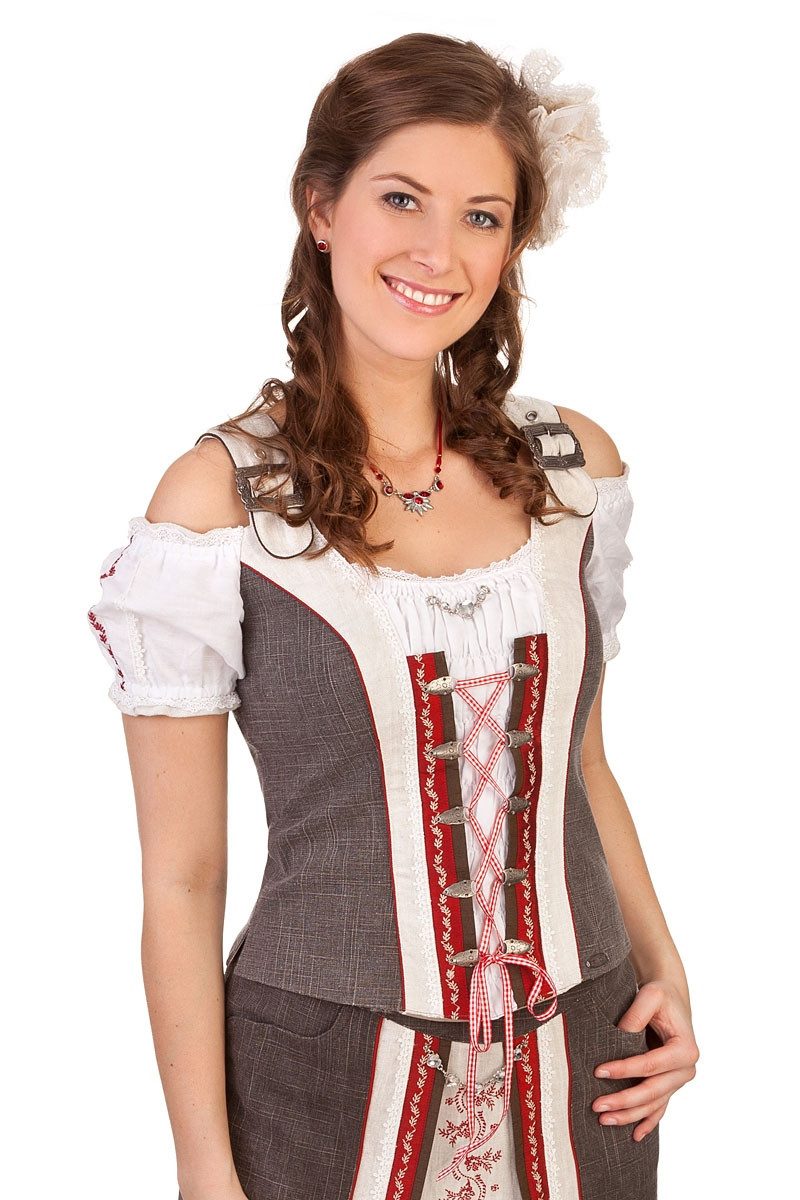 Edles Trachtenmieder im verführerischen Carmenstil liebevoll designed. Das Mieder ist kontrastreich aus verschiedenen Stoffen und im Farbenspiel aus Braun / Rot / Natur gearbeitet. Die Teilungsnähte sind kontrastreich abgepaspelt bzw. mit Borden und Spitzen hervorgehoben. Durch den gesmokten Bluseneinsatz, der unter der traditionellen Schürung liegt, wird eine optimale Passform garantiert. Das Mieder läßt sich über die verstellbaren Träger an Ihre Körpergröße anpassen. Der naturfarbene Rückenteil wird durch eine dezente rote Stickerei veredelt. Die sexy Carmenärmel sind im Mieder eingenäht. Das Mieder ist seitlich in braun gehalten und läuft vorn ca. 5 cm länger aus. Reißverschluß hinten. Komplett abgefüttert.