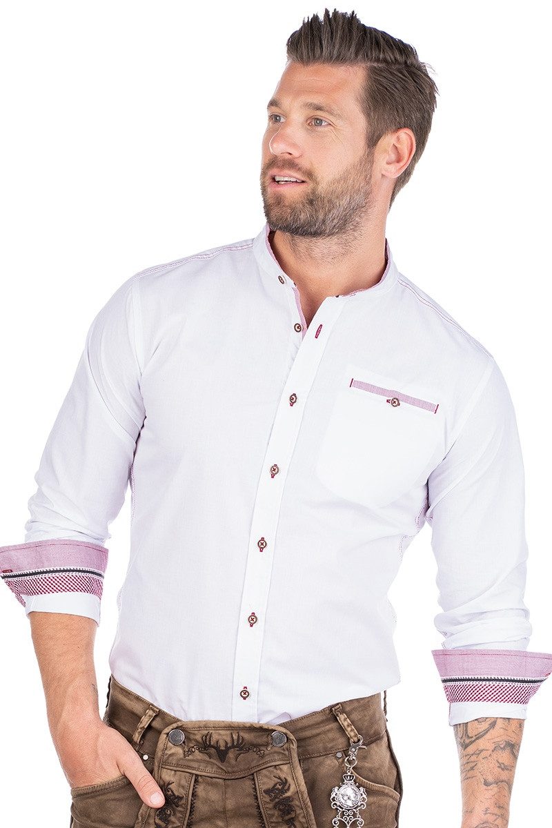 Edles weißes Slim Fit Trachtenhemd mit roten Akzenten, modern tailliert und ideal zu Lederhose oder Trachtenjeans