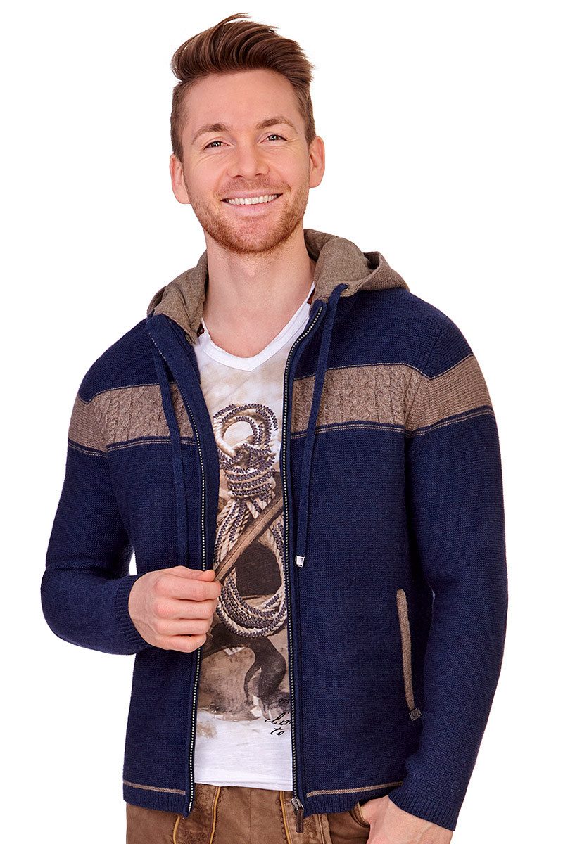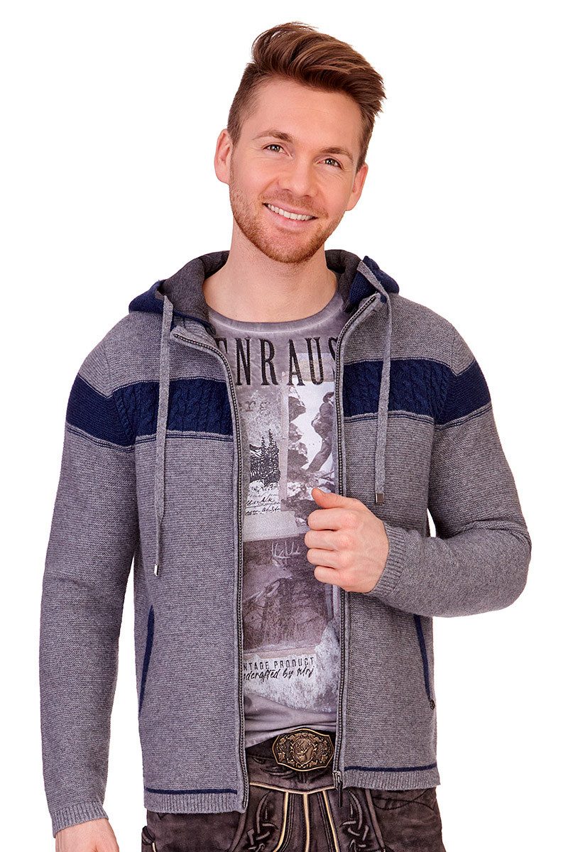 Remus, die kernige Strickjacke für Herren von der Marke Spieth & Wensky, ist der perfekte Begleiter zu Lederhose und Trachtenjeans. Der weiche Woll-Anteil macht sie kuschelig und das hauptsächlich schöne Strickmuster in Linksstrick-Art gibt ihr einen krachigen Look. Durch die schicken Farb- und Muster-Akzente erhält die Jacke einen pfiffigen Style. Die tolle Kapuze in Linksstrick-Art (quer) mit angenehmen Jersey-Futter im Melange-Look kann durch Knöpfe abgenommen werden und verfügt über ein Flachkordel-Zugband mit raffinierten Stoppern in Silber. Das Strickmuster der Kapuze ist mittig sowie am Saum um 90° gedreht. Die Oberkante und eine Zierlinie des schicken Stehkragens in Rippenstrick sind in Kontrastfarbe gestaltet. Vorn gibt es einen Reißverschluss, der durch gerollte Kanten verdeckt und mit einem rustikalen Anhänger in Leder-Optik geschmückt ist. Links und rechts vom Reißverschluss hat die Herrenjacke schmale Rippenstrick-Akzente zur Zierde und der schmale Bund mit einer eingearbeiteten Zierlinie in Kontrastfarbe sowie die Bündchen sind ebenfalls gerippt. Die Vorderseite ist in Brusthöhe in Kontrastfarbe mit schickem Zopf-Muster und Zierlinien betont. Dieser Kontrast geht ohne Zopfmuster an den Ärmeln weiter. Die beiden Eingrifftaschen vorn sind je mit einer breiten, kontrastfarbenen, leicht gewalkten Paspel hervorgehoben und verfügen über einen Reißverschluss mit Zippern in Leder-Art. Unterhalb der linken Tasche befindet sich zudem ein schönes Marken-Emblem aus Metall in Altsilber.