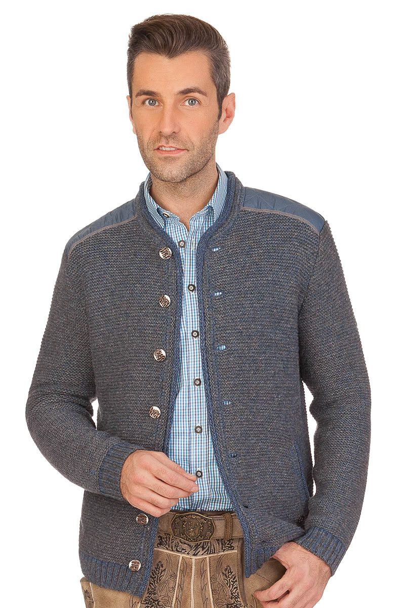 Die moderne Strickjacke Gerhard mit ihrem schönen Strickmuster in Hebemaschen-Form ist eine wunderbar sportive Interpretation von Tracht. Mit ihrem Steppeinsatz im Schulterbereich vorn und hinten und den trendy Ellenbogenschonern aus robusten Stoff kommt sie locker, fesch und jung daher. Der Kragen, die Knopfleiste und die zwei Eingrifftaschen vorn sind doppelt verstärkt gestrickt und farblich schick betont. Ebenso zieren die elastische Armbündchen eine farbliche Betonung, wie auch der elastische Saum mit abgesetzten Strickmuster. Am rechten Arm unten besitzt die Herren Jacke eine kleine schöne Hirschkopfstickerei und im Nackenbereich raffiniert aus Holz ein aufgenähtes Label. Zünftig urig schmücken den Janker die traditionelle Knöpfe in Hirschhorn-Optik. Die sportliche Jacke ist mit ihrem Innenfutter im Nackenbereich aus Baumwolle angenehm zu tragen und die weiche, feine Merinowolle hält bei kalten Temperaturen schön warm.