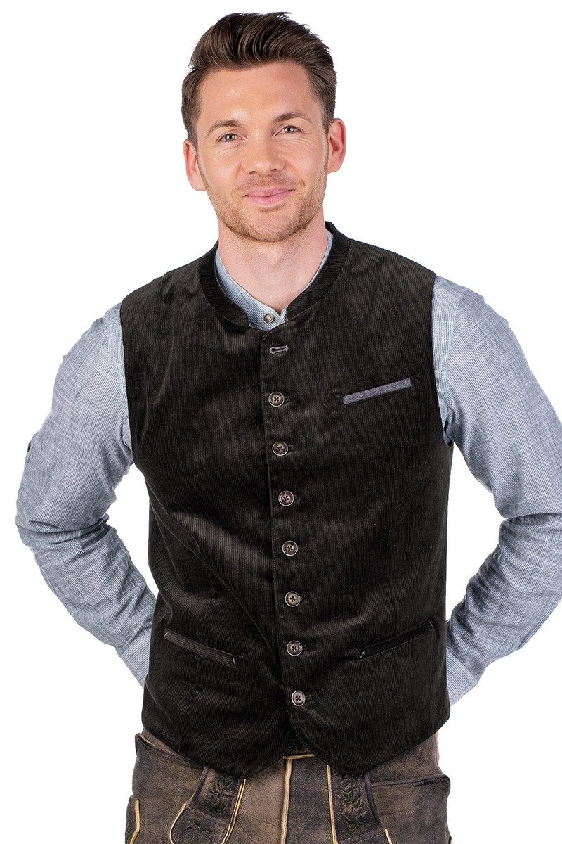 Diese tolle Herren Trachtenweste "East" aus samtigem Cordmaterial in dunklem Oliv wird aus feiner Baumwolle mit einem Stretch-Anteil gefertigt. Der Stehkragen ist verstärkt und verleiht der Weste eine markante Optik. Auch die Knopf- und Knopflochleiste sind verstärkt und schicke, marmorierte Knöpfe setzen stilvolle Akzente. Auf der linken Seite befindet sich eine Brusttasche, die mit einer Paspel im grauen Walk-Look betont ist. Zudem verfügt die Cordweste beidseitig über Eingrifftaschen mit je einer einfachen Paspel. Der Rücken besteht aus einem Kontraststoff mit feinem Webmuster in Schwarz sowie weißen Pünktchen Ein verstellbarer Rückenriegel mit altsilberner Schnalle sorgt für den perfekten Sitz. Das angenehme Futter aus Baumwolle mit Stretch-Anteil in Schwarz bietet zusätzlichen Komfort. Eine Innentasche auf der linken Seite rundet die Funktionalität der Weste ab. Diese Weste passt herrlich zur Lederhose und zum Trachten-Outfit. Bitte beachten Sie bei Размер 58 den Größenzuschlag.