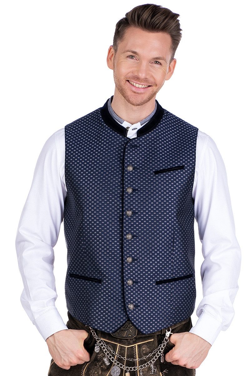 Die wundervolle Trachtenweste "Dietmar" für Herren begeistert mit einer Vorderseite im Jacquard-Stil und hat ein schönes Webmuster aus kleinen Ornamentik-Blüten in Greige/Tinte, oval umrahmt in Schwarz, auf einem Untergrund in Denimblau. Der Stehkragen besteht aus dunkelblauem Samt und ist mit einer dezenten, doppelten Ziernaht veredelt. Sowohl die mit urigen Ösenknöpfen mit Wappen-Motiv in Silber Antik besetzte Knopf- als auch die Knopflochleiste sind innen mit Walkmaterial verstärkt und mit einer Samtpaspel verziert. Auch die Brusttasche links sowie die Eingrifftaschen schmücken schmale, doppelte Paspeln aus Samt. Der dunkelgraue Kontrast-Rücken ist mit einem feinen, rustikal angehauchten Webmuster in Leinwandbindung-Art und einem schmalen Stoffriegel mit einer Schnalle in Silber für die perfekte Passform versehen. Das angenehme Futter aus Baumwolle in Schwarz komplettiert das Design, das außerdem links eine Innentasche bietet. Bitte beachten Sie den Größenzuschlag bei Размер 58.