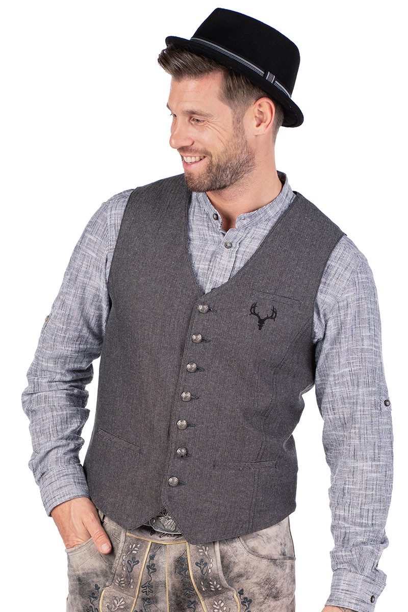 Die kernig-elegante, leicht taillierte Trachtenweste "Ector" für Herren wird vorn und seitlich aus feiner Baumwolle gefertigt und hat ein stilvolles, fein melangierte Streifen-Webmuster in Fischgrat-Art; der Rücken besteht aus Kontraststoff in Twill-Art in Schwarz und ist mit einem Riegel sowie einer altsilbernen Schnalle ausgestattet, die für einen perfekten Sitz sorgen. Der leicht abgerundete V-Ausschnitt und die Knopf-/Knopflochleiste sind abgepaspelt. Die beiden Eingrifftaschen vorne sowie die Brusttasche sind mit einer breiten Paspel aus Westenstoff versehen. Unter der linken Brusttasche befindet sich eine dezent schimmernde Hirschschädel-Stickerei in Schwarz, die einen besonderen Akzent setzt. Zudem zieren tolle, altsilberne Ösenknöpfe mit Wappen-Motiv das Gilet. Der Nacken, die Knopf- und Knopflochleiste sind mit Westenstoff verstärkt. Das angenehme Futter aus Baumwolle besitzt ein zünftig angehauchtes Längsstreifen-Webmuster und trägt zum hohen Tragekomfort bei. Diese Herrenweste stellt eine hervorragende Ergänzung zu einem Trachtenshirt oder Trachtenhemd dar. Beachten Sie bitte den Größenzuschlag bei Размер 58.