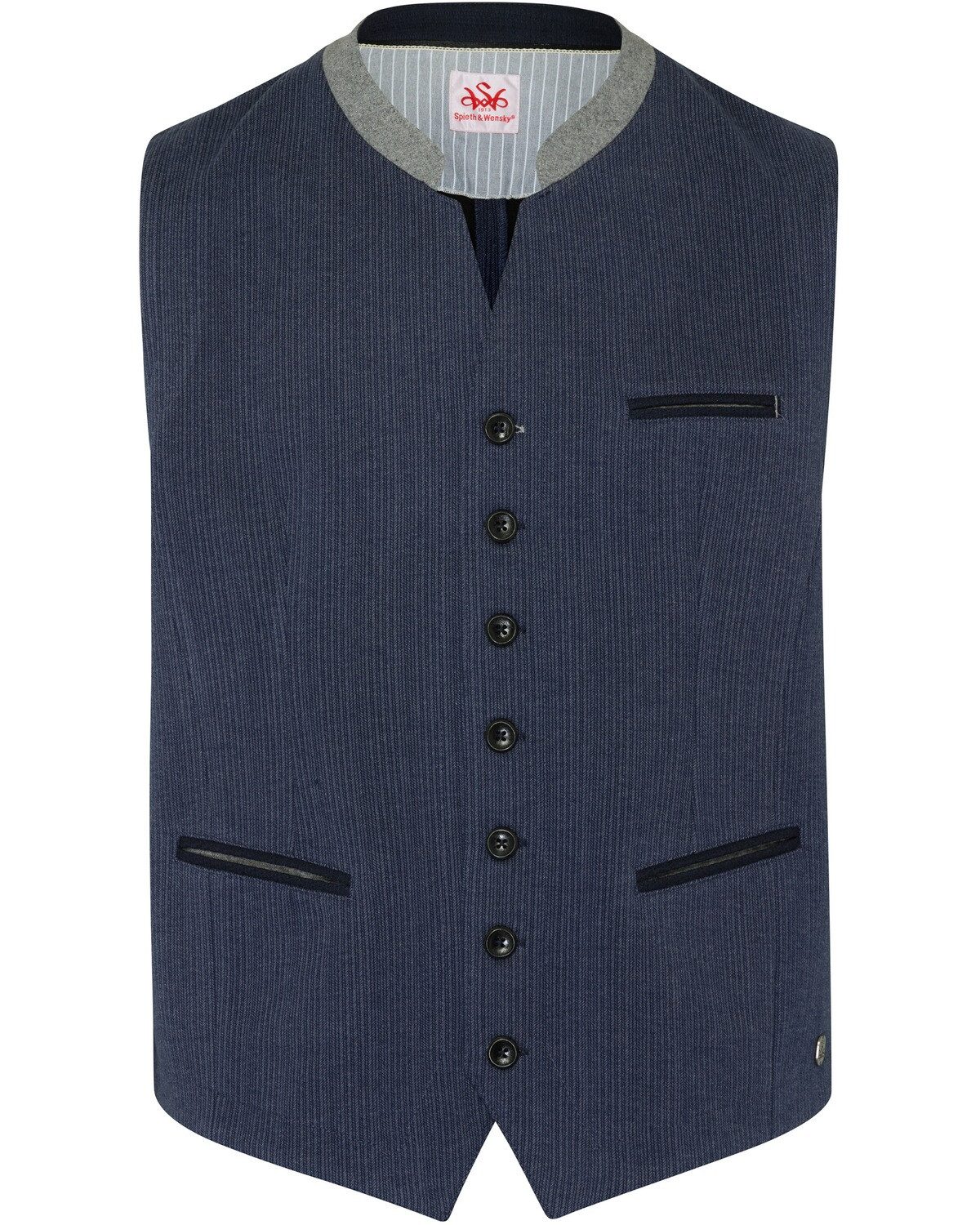 Zeitlose Eleganz mit moderner Struktur Die Herren Trachtenweste Friedo von Spieth & Wensky ist ein Beispiel für die gelungene Verbindung von traditionellem Stil und modernen Materialien. Gefertigt aus Jerseymaterial mit dezenter Streifenstruktur, bietet die Weste eine zeitlose Optik, die sowohl für festliche Anlässe als auch für den Alltag geeignet ist. Der kleine V-Ausschnitt zusammen mit dem kontrastfarbigen kurzen Stehkragen verleiht der Weste eine raffinierte Note. Praktische Details und durchdachtes Design Mit zwei Paspeltaschen unten und einer Paspel-Brusttasche bietet die Trachtenweste Friedo praktische Funktionalität und ausreichend Stauraum für kleine Utensilien. Der glatte Rücken aus dem gleichen Material wie die Vorderseite sorgt für ein harmonisches Gesamtbild. Die ungefütterte Verarbeitung macht die Weste angenehm leicht und komfortabel zu tragen, ideal für Herren, die Wert auf stilvolle und bequeme Kleidung legen. Oberstoff: 70% Polyester, 25% Viskose, 5% Elasthan