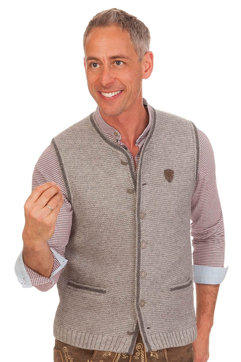 Wollig warm und fesch in Tracht! Die klassisch-zünftige Herren Strickweste Götter mit hohem Merino-Wollanteil hat ein schönes Strickmuster in Hebemaschen-Form, ist mit edlen, traditionellen Münzknöpfen aus Metall zu schließen und hat vorn zwei Eingrifftaschen. Auf der linken Brust ist eine kleine Walk-Applikation in Form eines kleinen Wappens mit Eichenblättern angebracht. Über der rechten Tasche befindet sich eine kleine Hirschkopf-Stickerei. Im Nackenbereich ist außen das Gründungsjahr der Marke als Label aufgenäht und innen ist er mit angenehmem Karostoff gefüttert. Der Kragen, die Knopfleiste, die Armausschnitte und die Tascheneingriffe sind farblich betont. Die weiche, feine Strickweste ist eine wundervolle Kreation der Trachtenmarke Spieth und Wensky.