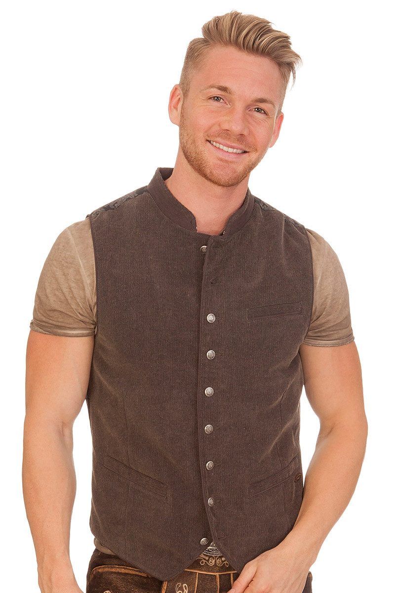 Die urige Herrenweste Helge zeigt sich als kernig-zünftiges Trachtenstück. Der Vorderteil besteht aus feinem, weichem Cord, hat zwei Eingrifftaschen und links eine schicke Brusttasche. Die Knopfleiste zieren elegante Knöpfe aus Metall mit einem Wappenmotiv. Der tolle Stehkragen ist mit einem Stoffbesatz und feschen Ziernähten aufgepeppt. Komplettiert wird die raffinierte Komposition der Marke Spieth und Wensky durch den edlen, dunkelgrau-mattglänzenden Westenrücken aus Taft mit prächtigem, floralem Paisleymuster. Der Rückenriegel mit silberner Schnalle sorgt für einen perfekten Sitz. Die herrlich authentische Herrenweste ist zudem sauber mit Satinstoff abgefüttert und hat eine Innentasche mit Reißverschluss. Bitte beachten Sie die Übergrößenzuschläge ab Размер 58.