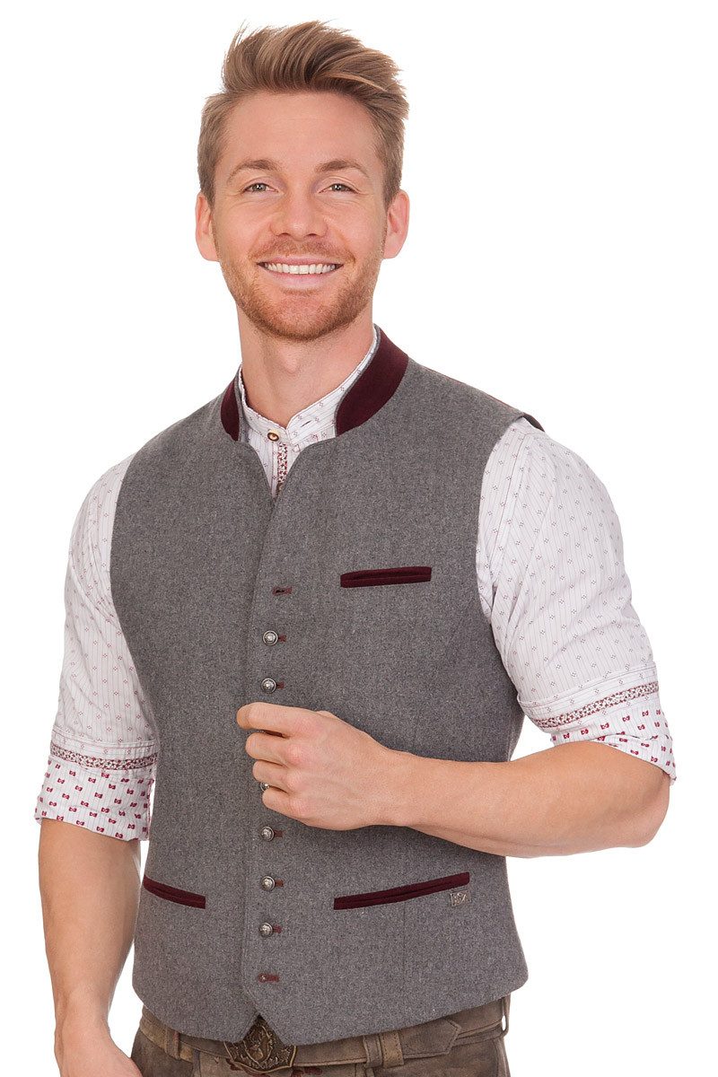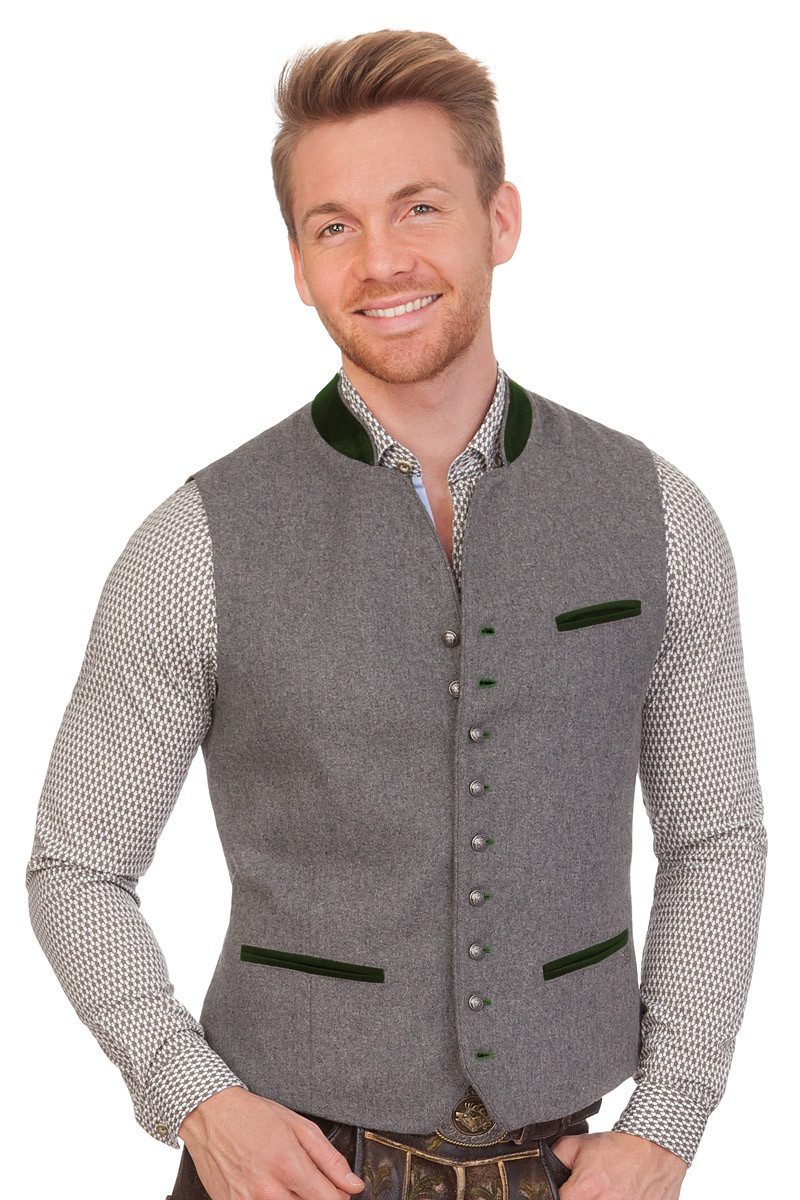 Die krachig-festliche Trachtenweste Mittenwald für Herren, ein Schmankerl aus der Trachtenschmiede Spieth & Wensky, überzeugt als perfekter Begleiter zum Oktoberfest. Sie besteht vorn aus feinem Loden in Melange-Optik und hat farbige Akzente aus Samt. Der elegante Stehkragen mit Samtbesatz und einer Loden-Paspel an der Außenkante ist verstärkt und innen mit einer Stoffborte verziert. Die grandiose Herrenweste verfügt über eine Brusttasche links und zwei Eingrifftaschen, alle verfeinert mit farbigen Paspeln aus Samt. An der linken Eingrifftasche ist ein kleines Marken-Emblem aus Metall angebracht. Die geschmackvollen, kleinen Knöpfe mit Wappen-Prägung in Altsilber zieren die Knopfleiste, die ebenso wie die Knopflochleiste abgepaspelt ist. Die Knopflöcher sind farbig umnäht. Der Rücken mit Stretch-Anteil aus edlem Jacquard mit zartem, floral anmutendem Webmuster ist für den perfekten Sitz mit einem Rückenriegel aus Loden sowie einer altsilbernen Schnalle ausgestattet. Unten mittig gibt es einen kleinen V-Schlitz. Die Weste ist angenehm gefüttert und hat eine Innentasche mit Reißverschluss. Bitte beachten Sie die Übergrößenzuschläge ab Размер 58.