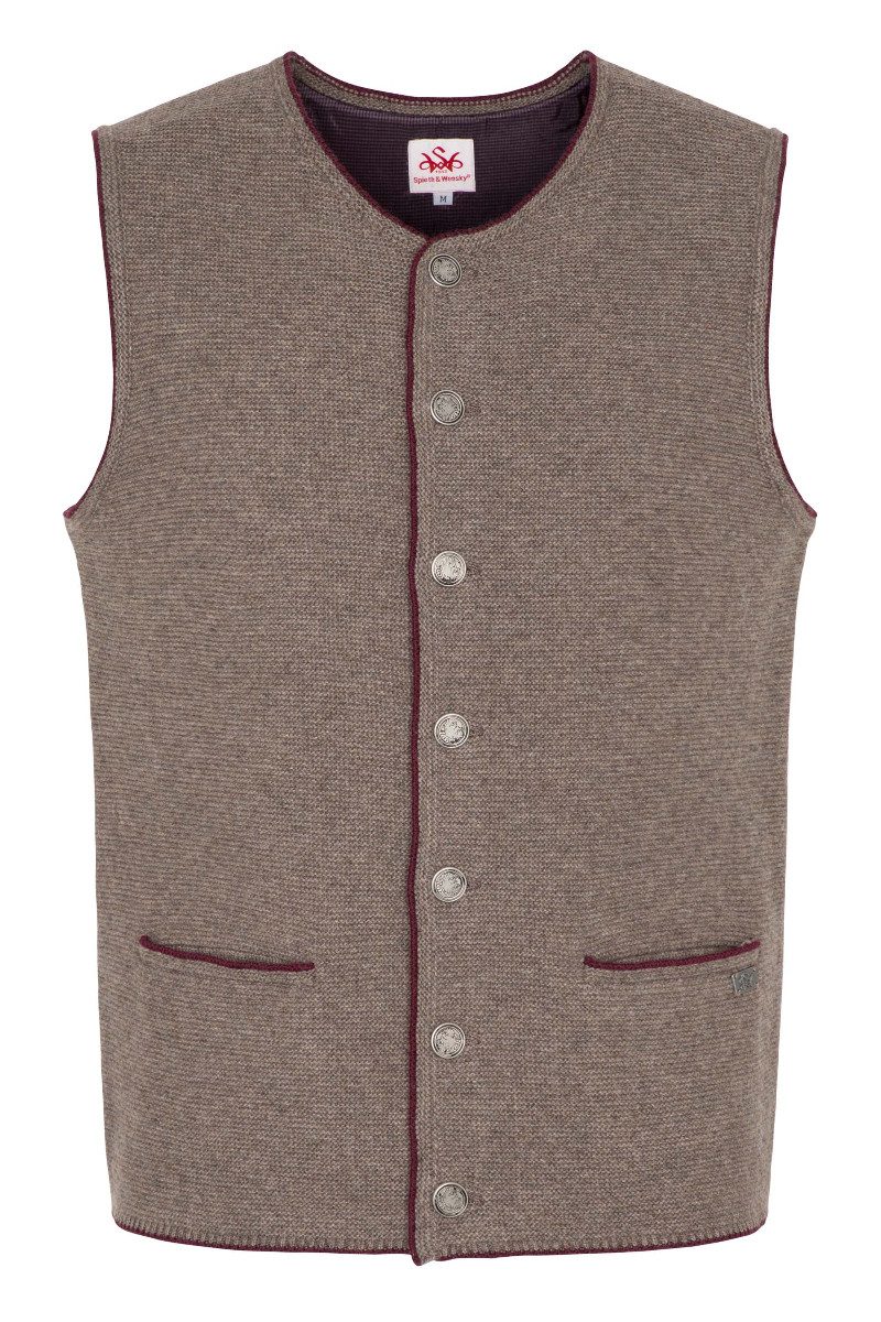 Diese herrliche Herren Strickweste namens Porto im kuschelig-kernigen Trachten-Style ist eine tolle Kreation mit weicher Wolle von der Trachtenmarke Spieth & Wensky. Die Trachtenweste hat allover ein klassisches Strickmuster im Linksstrick-Look in Nuss bzw. Oliv. Sowohl der schmale Saum in Rippenstrick-Art als auch der Rundhals-Ausschnitt, die Armausschnitte, die Tascheneingriffe, die Knopf- und Knopflochleiste sind fein abgesetzt. Die Außenkanten bei der nuss-farbenen Варианты sind in Burgund bzw. bei der oliv-farbenen Варианты in Grau dezent hervorgehoben. Glänzende, altsilber-farbene Münzknöpfe mit Wappen-Motiv zieren die Knopfleiste. Die linke der beiden Eingrifftaschen vorn ist mit einem kleinen Marken-Emblem aus Metall bestückt und der Nackenbereich verfügt partiell über angenehmes Karofutter.