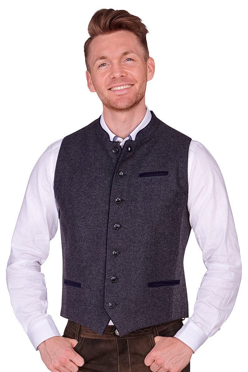 Die zünftige Trachtenweste Sieblingen in Anthrazit, eine fantastische Kreation für Herren von der Marke Spieth & Wensky, ist leicht tailliert geschnitten und wird mit viel feiner Wolle gefertigt. Sowohl der schicke Stehkragen als auch die Vorderseite haben ein kerniges Webmuster, die Seiten sind aus Webstoff im Fischgrat-Look gearbeitet und der Rücken aus leicht gewalktem Strickmaterial hat ein feines Rippenstrick-Muster. Der Kragen sowie die Knopf- und Knopflochleiste sind innen mit dunkelblauem Kontraststoff verstärkt, der außen als Paspelkante sichtbar ist, und die Vorderseite hat ein angenehmes, gebondetes Futter aus Jersey-Material. Elegant geformte Knöpfe im Holz-Look schmücken die Knopfleiste. Zudem verfügt das Gilet über eine Brusttasche links und zwei Eingrifftaschen vorn, allesamt als doppelte Paspeltaschen aus Kontraststoff in Dunkelblau gearbeitet. Die Herrenweste lässt sich herrlich zur Krachledernen und Kniebundlederhose kombinieren.