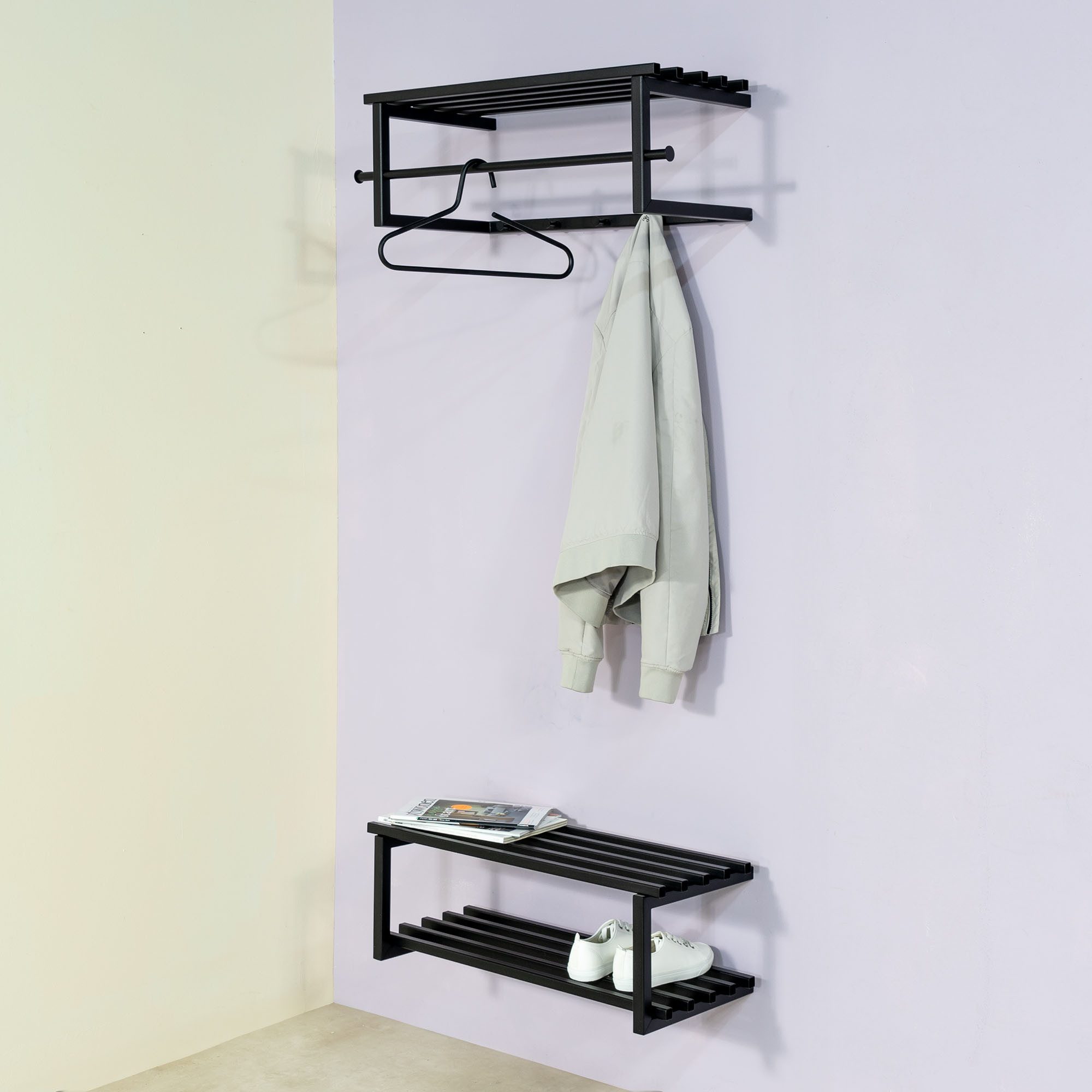 Entdecke die Garderobenleiste »MARCO« von Spinder Design, eine multifunktionale wandmontierte Garderobe für deine Einrichtung. Elegant und zugleich funktionsreich entworfen, hebt das pulverbeschichtete Stahlmaterial seine Beständigkeit und seinen zeitgenössischen Charme hervor. Haken, eine Hutablage und eine Kleiderstange bieten genügend Platz, um all deine Garderobenutensilien ordentlich und griffbereit zu halten. Ein einfaches und praktisches Design mit dem du deinen Eingangsbereich stilvoll gestalten und organisieren kannst. Und das Beste ist, dass du die Farbe der Garderobenleiste wählen kannst, die am besten zu deiner Inneneinrichtung passt. Lass dich überraschen, wie einfach Ordnung sein kann mit der Garderobenleiste »MARCO« von Spinder Design.