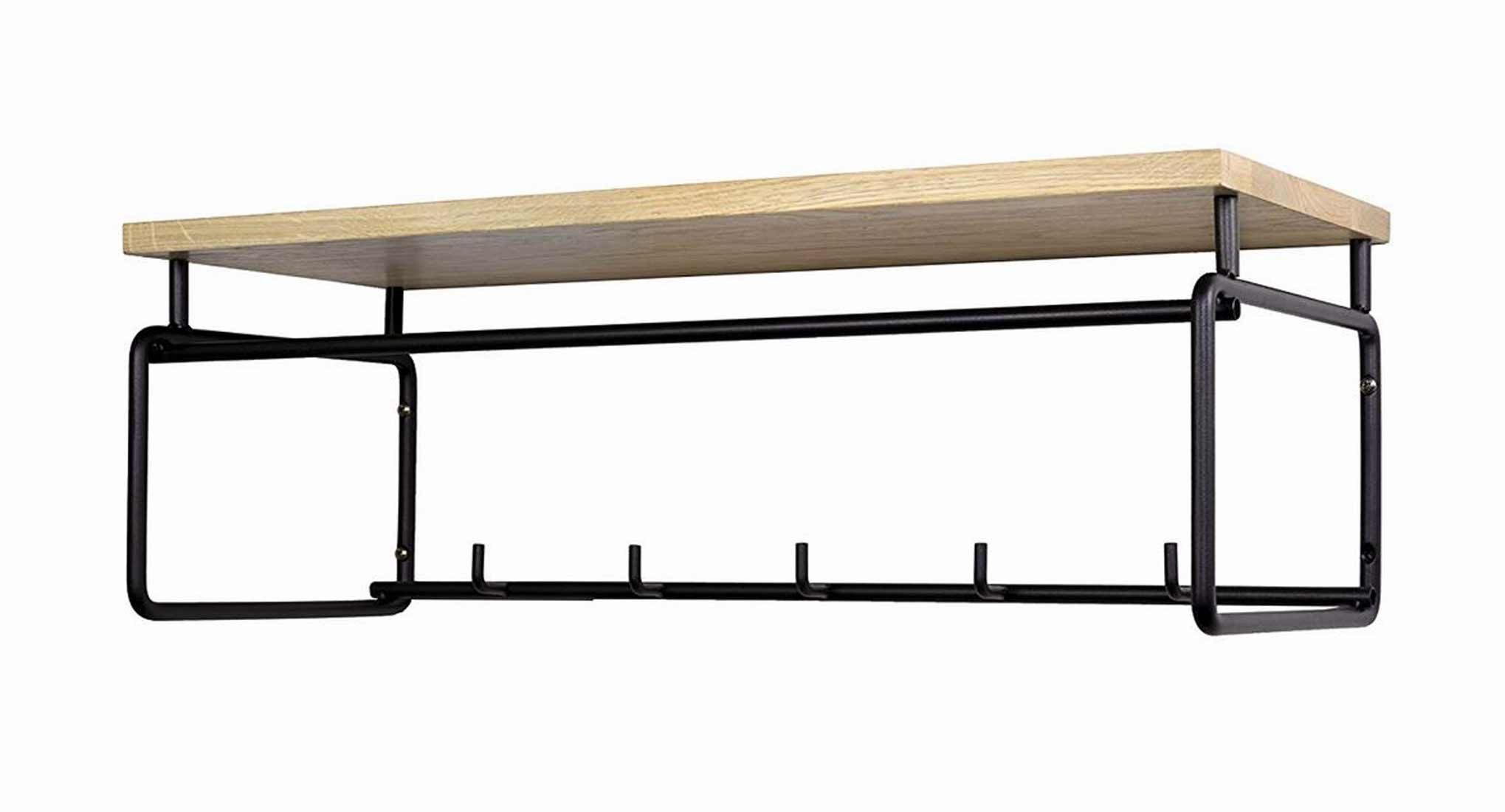 Das Modell weist einen Rahmen aus massivem Stahlrohr in der Farbe Schwarz auf. Insgesamt fünf Haken dienen zum Aufhängen der Jacken, Mäntel, Rucksäcke und Taschen. Eine massive Holzplatte aus Eiche ist als Hutablage vorgesehen.