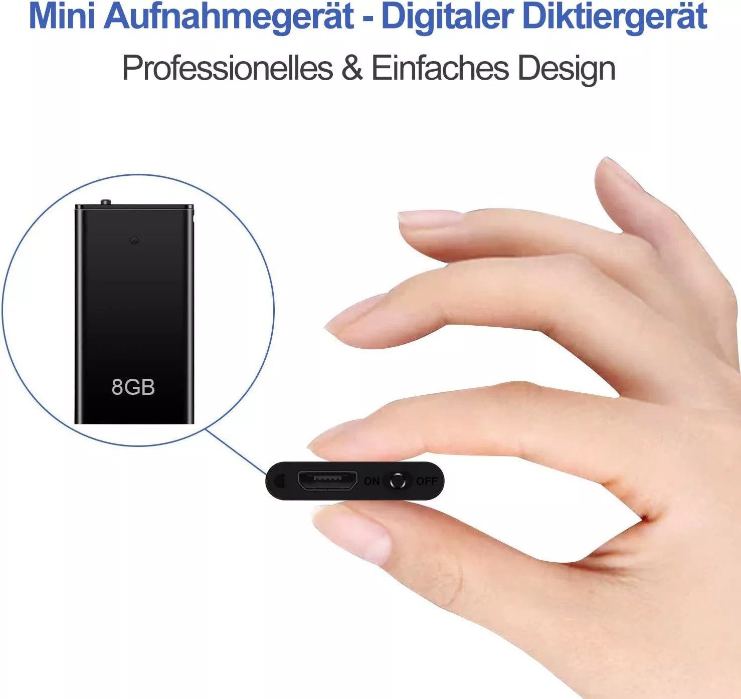 Lieferumfang | 1x Mini Voice Recorder, 1x 8GB Speicher (eingebaut), 1x Kopfhörer, 1x Usb Kabel, 1x deutsche Bedienungsanleitung, 1x Originalverpackung, 1x Rechnung inkl. 19% MwSt. |