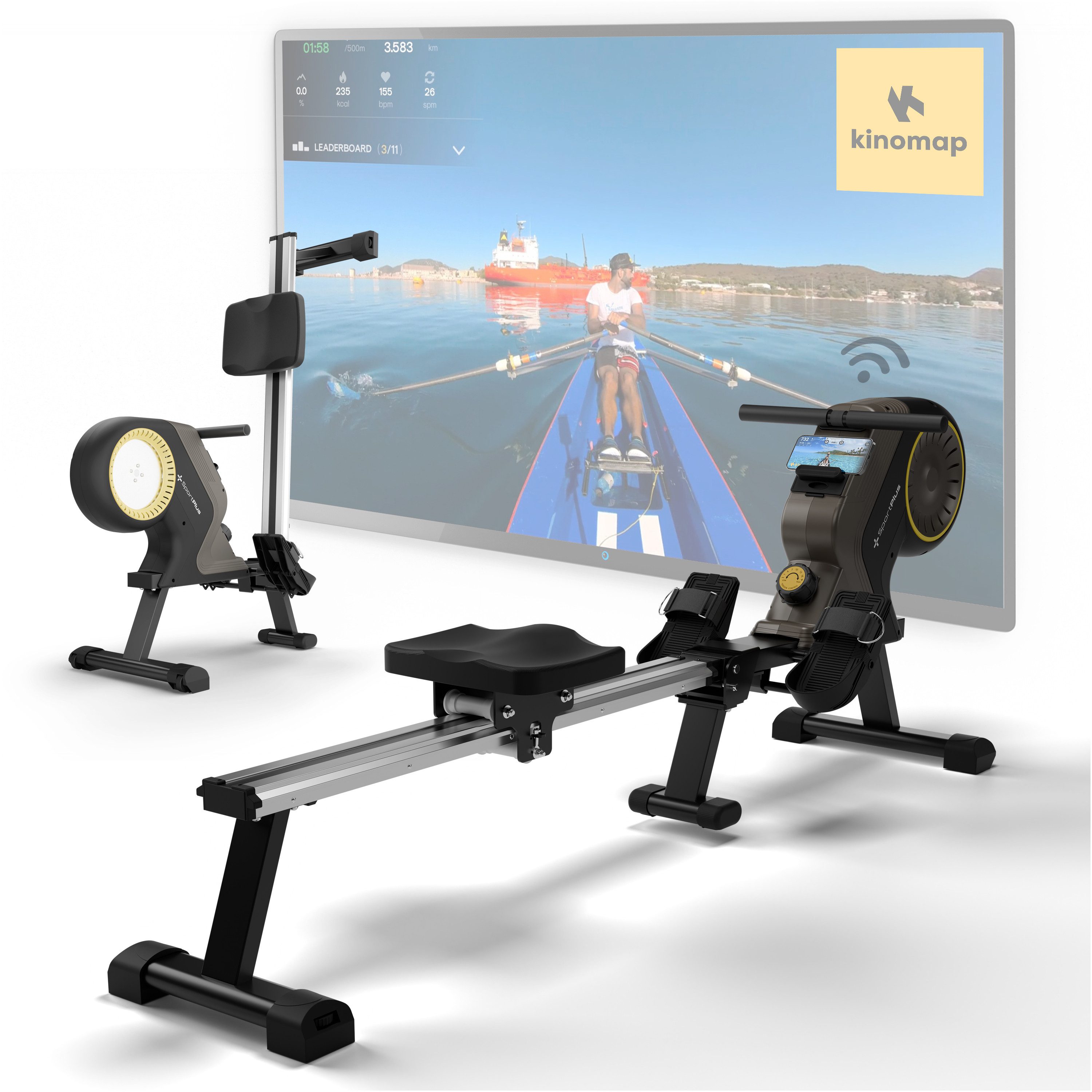 Der kugelgelagerte Rudersitz gleitet präzise auf der hochwertigen Alu-Schiene. Rutschfeste Trittflächen mit verstellbaren Riemen garantieren Stabilität und Sicherheit. Optional kann ein Brustgurt (5 kHz) zur Pulsmessung verbunden werden – Trainingsdaten wie Zeit, Kalorienverbrauch und Ruderschläge lassen sich bequem auf dem integrierten Display ablesen.
