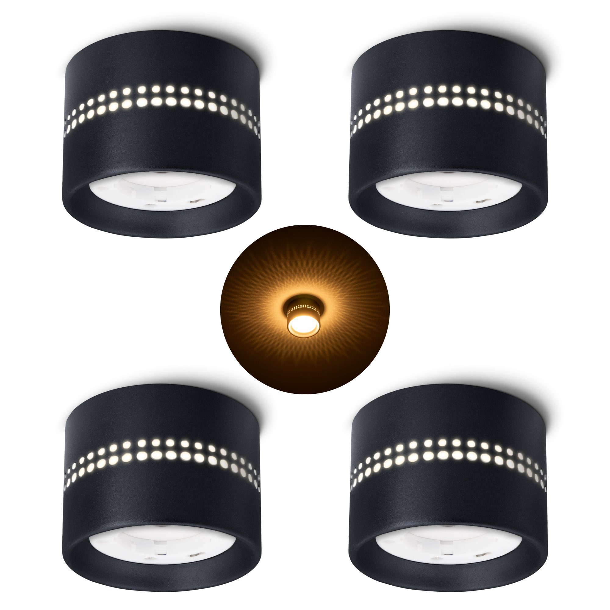 Die moderne Deckenaufbauleuchte in elegantem Schwarz verleiht jedem Raum eine subtile Eleganz. Das optische Highlight sind die seitlichen Löcher am Lampenkorpus des Deckenspots, durch die das warmweiße Licht des eingebauten LED Stripes sanft hindurchscheint. Dadurch entsteht ein einzigartiger indirekter Lichteffekt, der Ihren Wohnräumen eine besondere Atmosphäre verleiht. Die Deckenlampe schwarz rund ist nicht nur ein funktionales Beleuchtungselement, sondern auch ein Blickfang in jedem Zuhause.
