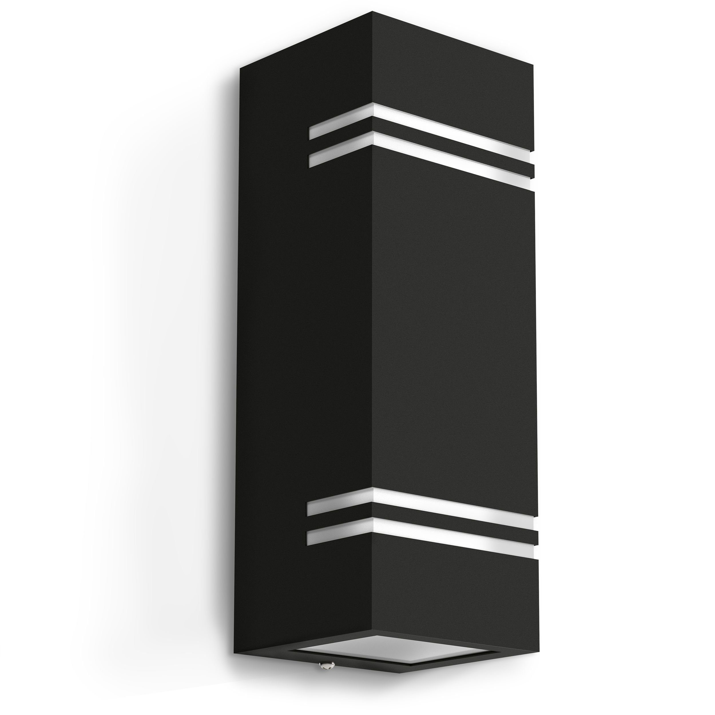 Ein modern eckiges Design in matt schwarz gefärbten Edelstahlgehäuse wertet jede Fassade auf. Mit dem Up & Down Licht bieten es die geradlinigen Maße an, auch mehrere Leuchten an Wänden, Eingänen, im Garten oder vor der Haustür zu verwenden.