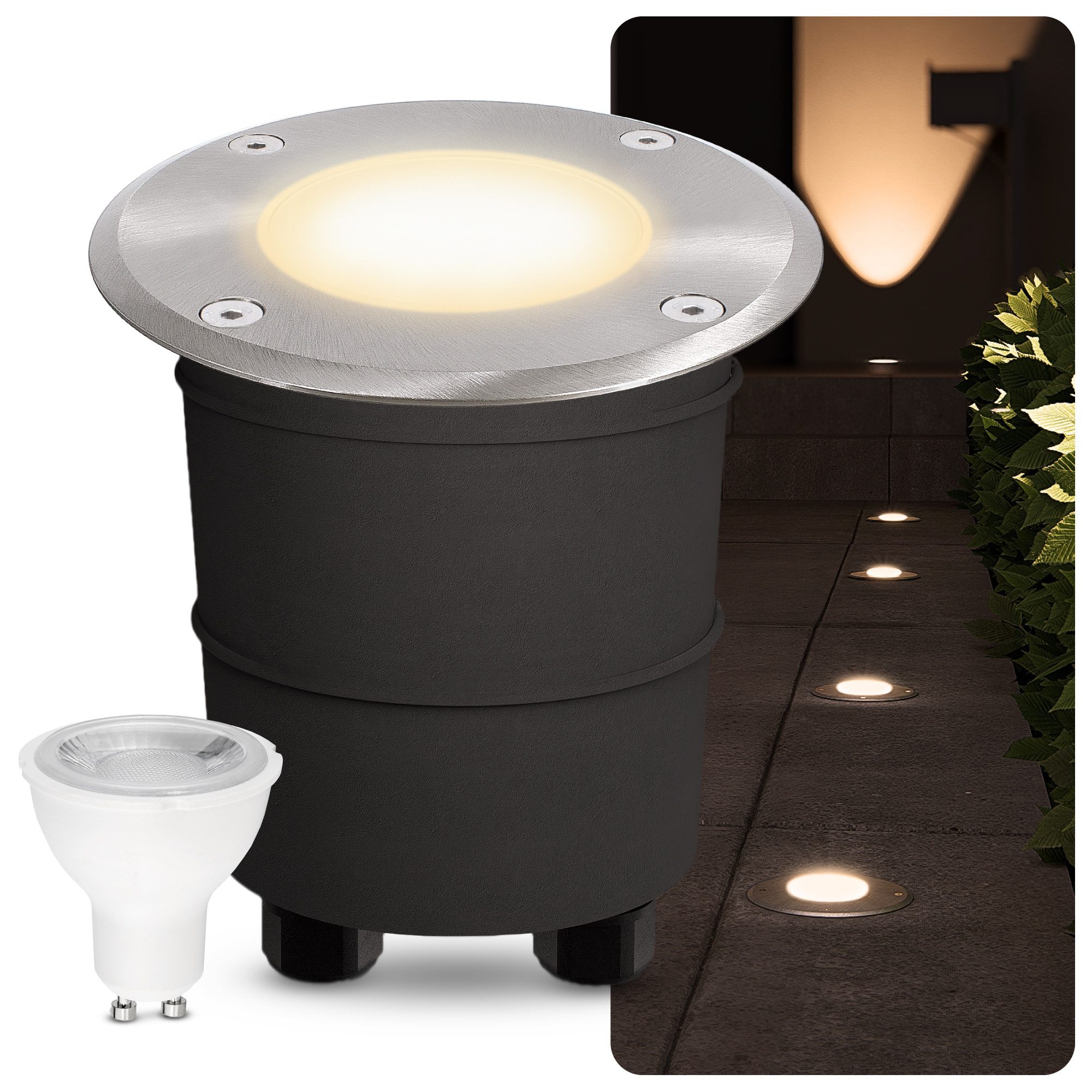 Lieferumfang | 1x Bodeneinbaulampe MARNE IP67-1x LED Leuchtmittel GU10 6W warmweiß 230V- |