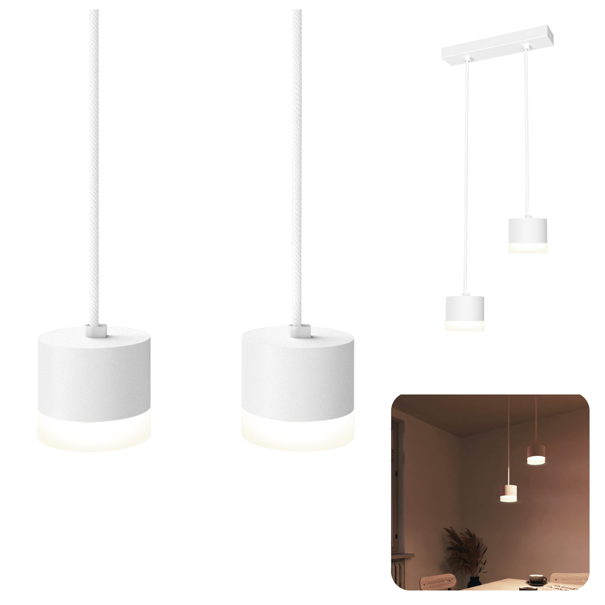 Lieferumfang | 1x VORA Pendelleuchte 2-flammig in weiß-2x GX53 LED Leuchtmittel dimmbar neutralweiß- |
