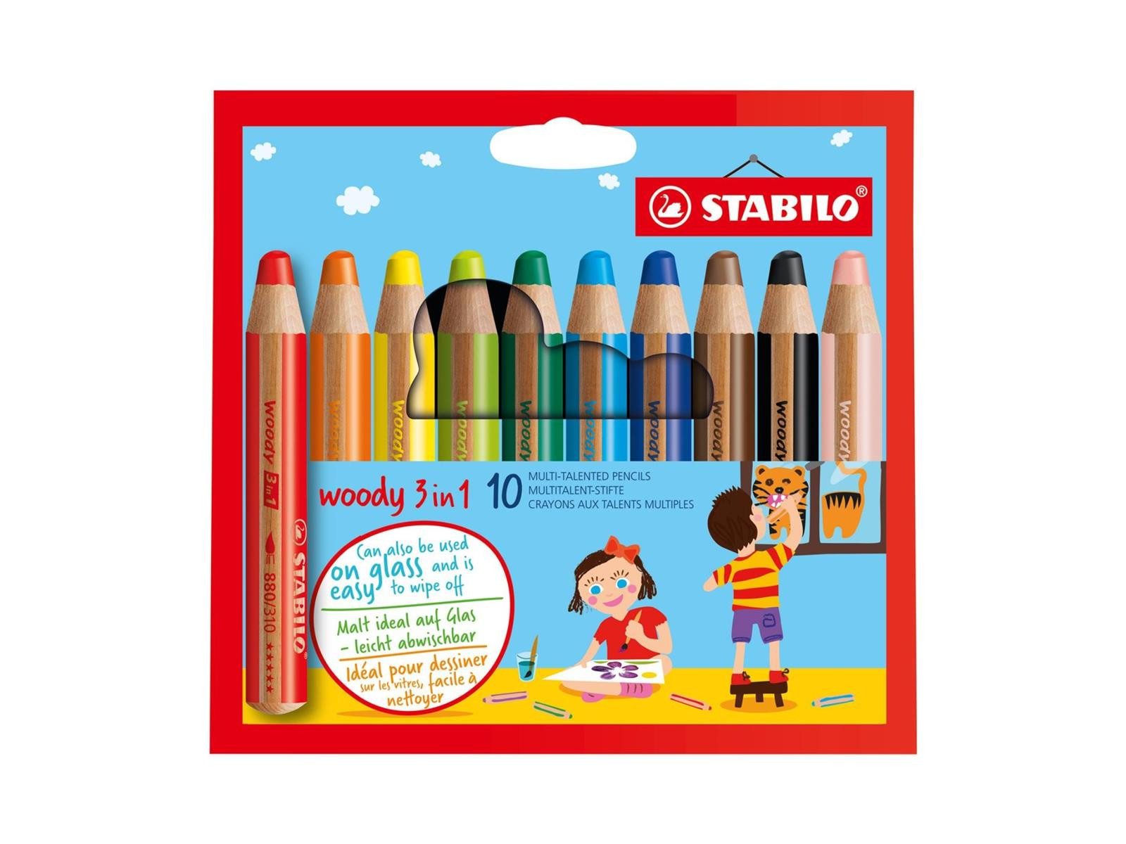 Der STABILO woody 3 in 1 ist ein außergewöhnliches Multitalent: Er ist Buntstift, Wassermalfarbe und Wachsmalkreide in einem.Mit seiner hohen Deckkraft und Farbintensität eignet er sich super für dunkles und schwarzes Papier sowie für Kratzbilder. Er lässt sich spielend leicht mit einem Pinsel aquarellieren und zaubert dabei tolle Kunstwerke aufs Papier. Auch auf glatten Oberflächen wie Glas und Metall funktioniert er hervorragend und lässt sich von Glas mit Wasser auch ganz einfach wieder entfernen. Der STABILO woody 3 in 1 ist so ergiebig wie acht Standard-Buntstifte. Seine runde und dicke Form eignet sich besonders für kleine Kinderhände.
