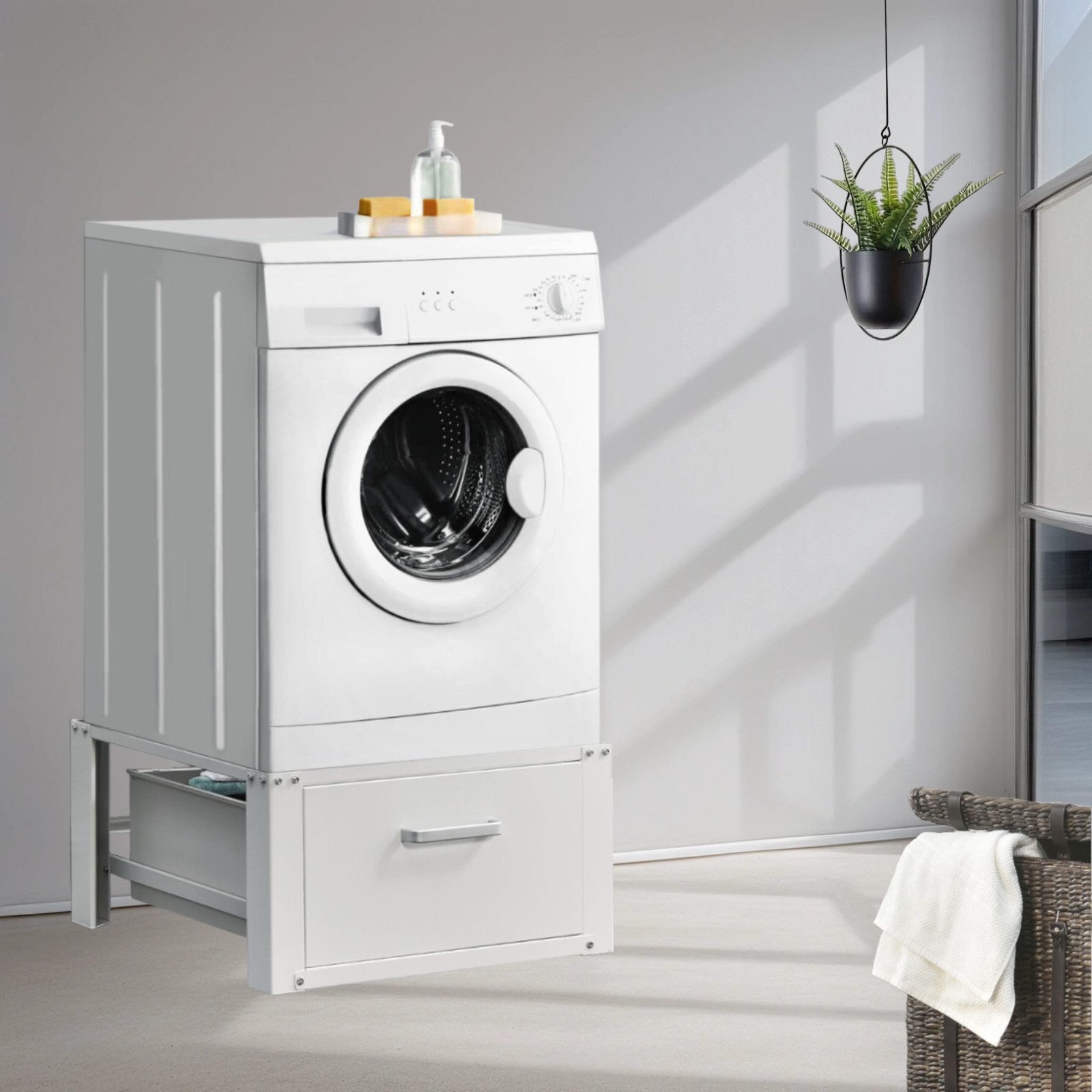 Bei der Konstruktion wurde akribisch darauf geachtet, dass das Gestell eine praktische Hilfe im alltäglichen Leben bietet. Dementsprechend haben unsere Podeste ausziehbare Schubladen mit einer maximalen Tiefe von 38 cm verbaut. Hierdurch wird Ihnen nützliche Ablagefläche bzw. Stauraum geboten, indem Ihr Wäschezubehör (bspw. Waschmittel) einfach verstaut werden können.