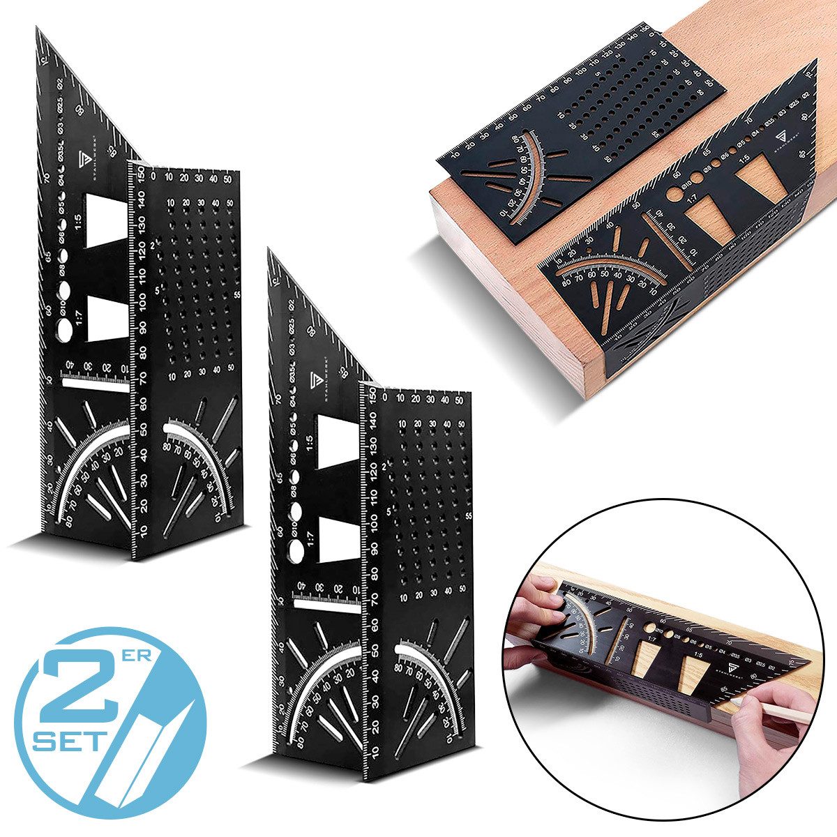 STAHLWERK Winkelmesser 2er Set Gehrungswinkel-Lineal mit Anschlag und Bohrlehre, L:22,5 cm, (Set, Set), gefertigt aus leichtem Aluminium