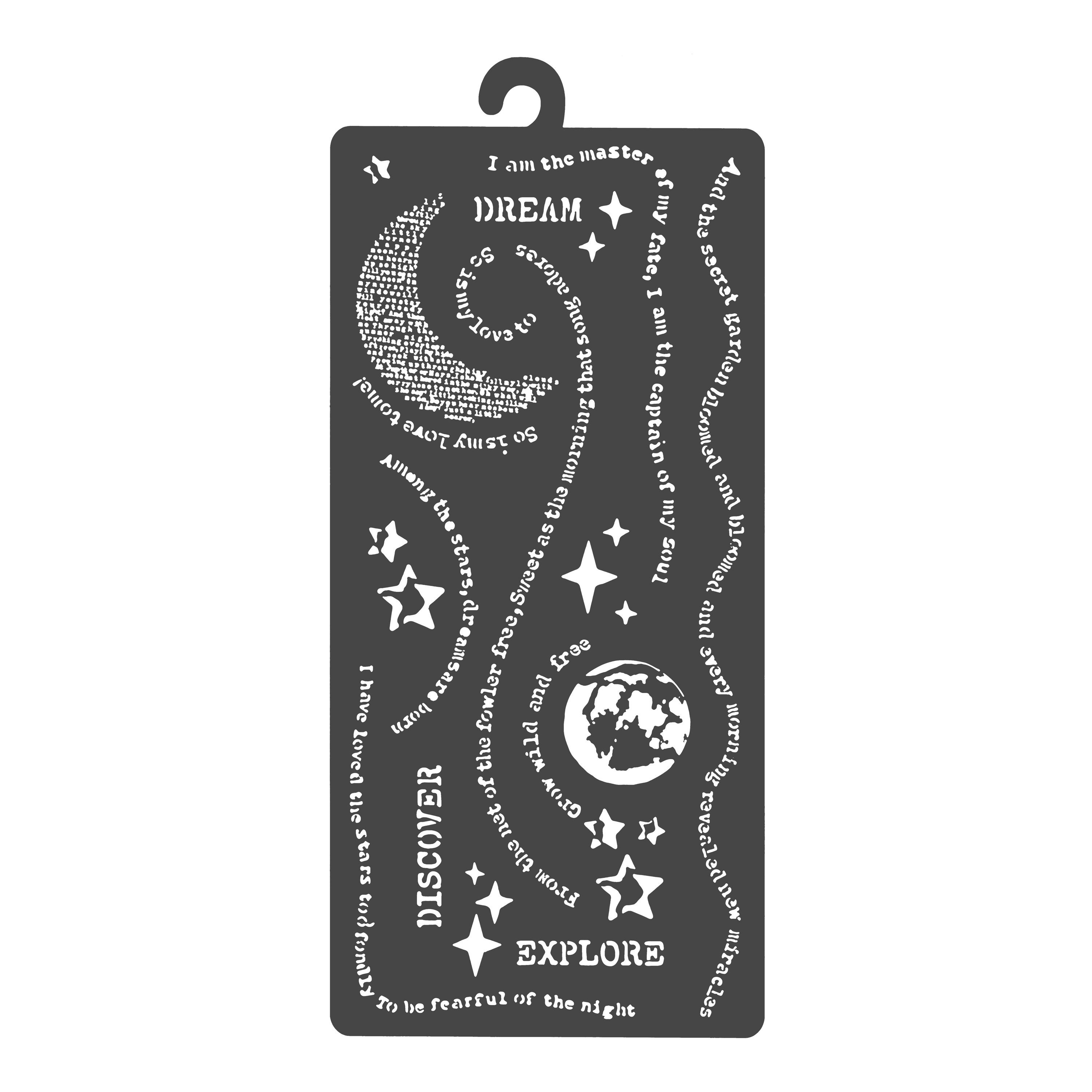 Mit der Schablone 'Secret Diary - Diary Dream' kannst du deine kreativen Ideen zum Leben erwecken. Die Schablone bietet dir 26 einzigartige Motive wie Sterne, Schrift und die Erde, die du ganz nach deinen Vorstellungen gestalten kannst. Egal ob du mit Farben, Pasten oder Sprays arbeitest, die Schablone ist vielseitig einsetzbar und ermöglicht dir unendliche Gestaltungsmöglichkeiten. Die Anwendung ist ganz einfach: Lege die Schablone auf dein gewünschtes Material und trage die Farbe auf. Nach der Verwendung kannst du die Schablone ganz einfach mit Wasser und Spülmittel reinigen. Lass deiner Kreativität freien Lauf und gestalte einzigartige Kunstwerke mit der Schablone 'Secret Diary - Diary Dream'.