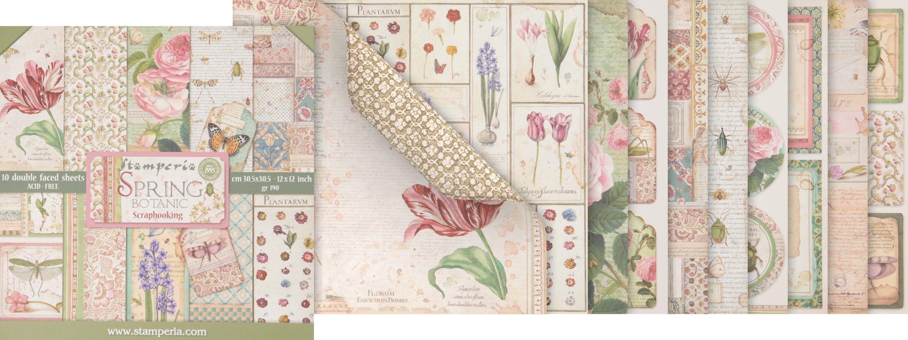 Toller Scrapbook-Block 'Spring Botanic' im Format 30,5 x 30,5 cm mit schicken Motiven zum Thema Frühling. Hervorragend zur Gestaltung von Karten, Foto-Alben und für die Falttechnik.