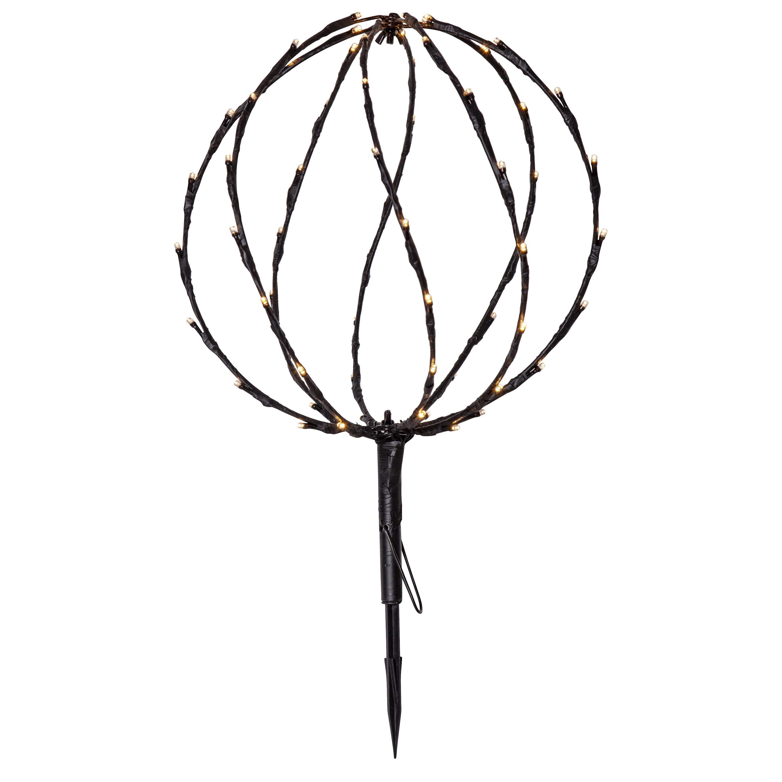 Die LED-Dekoration SPHERE besteht aus einer schwarzen Kugel-Sphäre, an der ein Erdspieß sowie ein Aufhänger befestigt wurde. Die 64 integrierten LEDs strahlen ein angenehmes warmweißes Licht aus und erschaffen so eine gemütliche Atmosphäre. Mit dem Timer kann die Deko-Leuchte auf eine Brenndauer von 6 Stunden mit einer Ruhepause von 18 Stunden eingestellt werden, was sich wiederholt. Mit den Maßen 30 x 44 cm eignet sich die Leuchte ideal für die Dekoration im Außenbereich, beispielsweise als Erdspieß in einem Blumentopf oder an einem Kabel aufgehängt auf dem Balkon. Die Kugel-Leuchte ist außerdem faltbar und kann so leicht verstaut werden, wenn sie einmal nicht gebraucht wird. Die benötigten Batterien sind nicht im Lieferumfang enthalten.