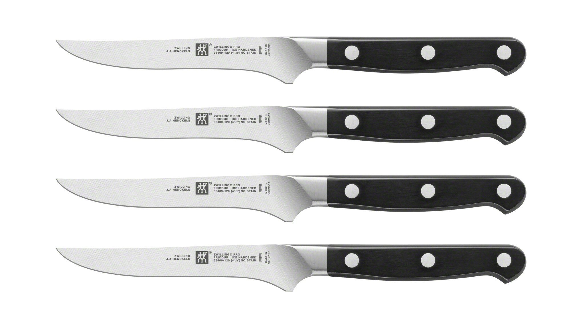 Zwilling® Pro Steakset, 4 x Steakmesser 120 mm Hergestellt in Deutschland Das 4-teilige Steakmesser-Set von ZWILLING besteht aus hochwertigen und langlebigen Messern. Diese eignen sich für das Zerteilen eines saftigen Rindersteaks aus der Pfanne, eines marinierten Steaks vom Grill oder eines Wiener Schnitzels. Die Messer schneiden mühelos ein leckeres gegrilltes Steak sowie sämtliche kurzgebratene Gaumenfreuden. Ebenso sorgt das klassische Drei-Nieten-Design für eine ansprechende Optik. Mit dem zweistufigen V-Edge-Abzug bieten die Messer eine lang anhaltend hohe Schneidleistung und optimale Schärfe. Das Material zeichnet sich durch Geschmacksneutralität und Korrosionsbeständigkeit aus. Die stoßfesten Messer sind äußerst widerstandsfähig und robust. Dank der scharfen Klinge haben Sie mit diesem Set stets die passenden Messer zur Hand. Der angeschliffene Rücken der Klinge und die glatte Wate sowie der hochwertige ABS-Kunststoffgriff verleihen den Messern ein attraktives Erscheinungsbild. Die SIGMAFORGE-Messer wurden mit einem speziellen Schmiedeverfahren aus einem Stück Stahl geschmiedet. Durch diese Vorgehensweise werden eine hohe Schnitthaltigkeit, Flexibilität und Härte erreicht. Dank des speziell geformten Griffes liegen die Messer gut in der Hand und können sicher geführt werden. Mit diesem Messer-Set der Serie ZWILLING® Pro haben Sie erstklassige Steakmesser für den Alltag und ein besonderes Event zur Hand. FRIODUR® eisgehärtete Klinge für besonders lange Haltbarkeit der Schneide und Korrosionsbeständigkeit. Rostfreier Spezialstahl, ZWILLING Sonderschmelze: Diese Messer sind stabil, korrosionsbeständig und zugleich flexibel. SIGMAFORGE® Messer – aus einem Stück geschmiedet V-Edge Abzug: Der zweistufige V-Edge-Abzug sorgt zusätzlich für lang anhaltende Schärfe und bietet so eine dauerhaft hohe und präzise Schneidleistung. Ergonomischer Griff aus Kunststoff mit Drei-Nieten Design: Für ermüdungsfreies und sicheres Arbeiten mit dem Messer.